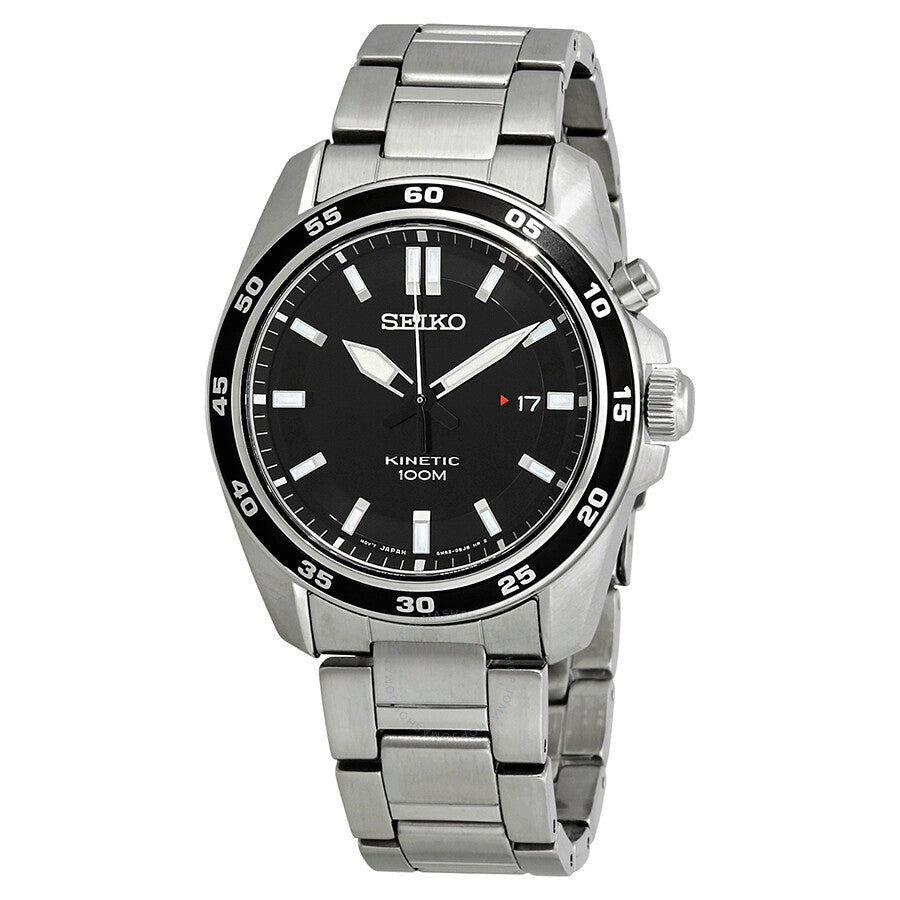 Stainless steel case with a stainless steel bracelet. Fixed stainless steel bezel with a black ion-plated inlay. Black dial with luminous silver-tone hands and index hour markers. Minute markers around the outer rim. Dial Type: Analog. Luminescent hands and markers. Date display at the 3 o'clock position. Kinetic movement. Scratch resistant Hardlex crystal. Pull / push crown. Round case shape. Case size: 42 mm. Case thickness: 11 mm. Band width: 22 mm. Fold over clasp. Water resistant at 100 meters / 330 feet. Functions: date, hour, minute, second. Casual watch style. Seiko Kinetic Black Dial Stainless Steel Men's Watch SKA785.