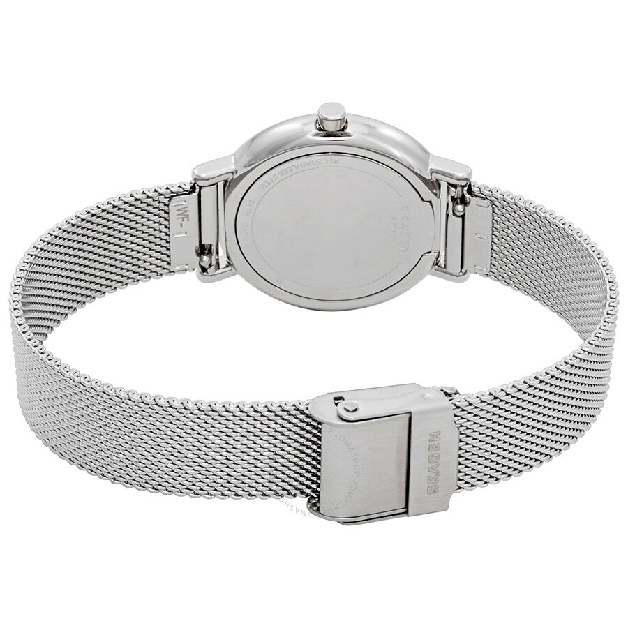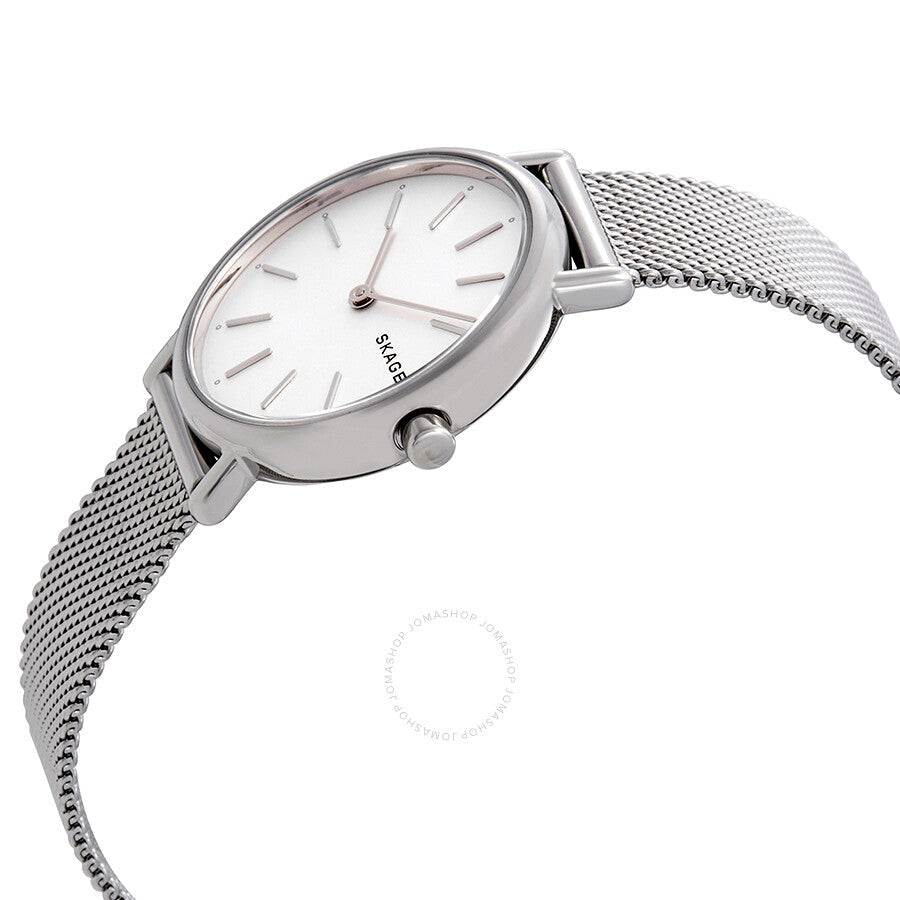 Stainless steel case with a stainless steel mesh bracelet. Fixed stainless steel bezel. White dial with silver-tone hands and index hour markers. Dial Type: Analog. Quartz movement. Scratch resistant mineral crystal. Pull / push crown. Solid case back. Round case shape. Case size: 30 mm. Case thickness: 6 mm. Band width: 14 mm. Fold over slip through clasp. Water resistant at 30 meters / 100 feet. Functions: hour, minute. Casual watch style. Watch label: Japan Movt. Skagen Signatur White Dial Ladies Watch SKW2692.