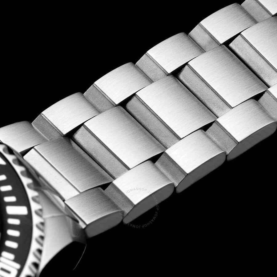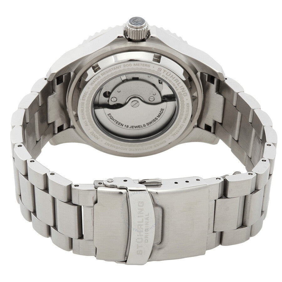 Stainless steel case with a stainless steel bracelet. Uni-directional rotating (120 click) stainless steel bezel with an inlaid black-plated (count-up elapsed time) top ring. Black dial with luminous silver-tone Mercedes-logo and Breguet-style hands and dot hour markers. Minute markers around the outer rim. Dial Type: Analog. Luminescent hands and markers. Date display at the 3 o'clock position. Claro calibre CL888 automatic movement, containing 18 Jewels, bitting at 21600 vph, and has a power reserve of approximately 38 hours. Scratch resistant Krysterna crystal. Screw down crown. Solid case back. Round case shape. Case size: 42.2 mm. Case thickness: 14.4 mm. Band width: 20 mm. Band length: 7.5 inches. Fold over clasp with a safety release. Water resistant at 200 meters / 660 feet. Functions: date, hour, minute, second. Aquadiver Series. Dive watch style. Watch label: Swiss Movt. Stuhrling Original Aquadiver Automatic Black Dial Men's Watch M13534.