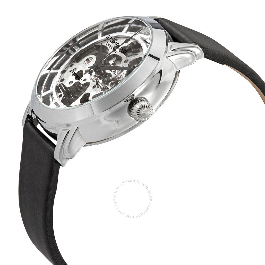 Silver-tone alloy case with a black leather strap. Fixed silver-tone alloy bezel. Silver skeleton dial with black hands and index hour markers. Arabic numerals appear at the 3, 6, 9 and 12 o'clock positions. Dial Type: Analog. Automatic movement. Scratch resistant mineral crystal. Pull / push crown. Transparent case back. Round case shape. Case size: 40 mm. Case thickness: 13 mm. Band length: 8.5 inches. Tang clasp. Water resistant at 50 meters / 165 feet. Functions: hour, minute, second. Legacy Series. Dress watch style. Stuhrling Original Legacy Automatic Silver Dial Ladies Watch M13638.