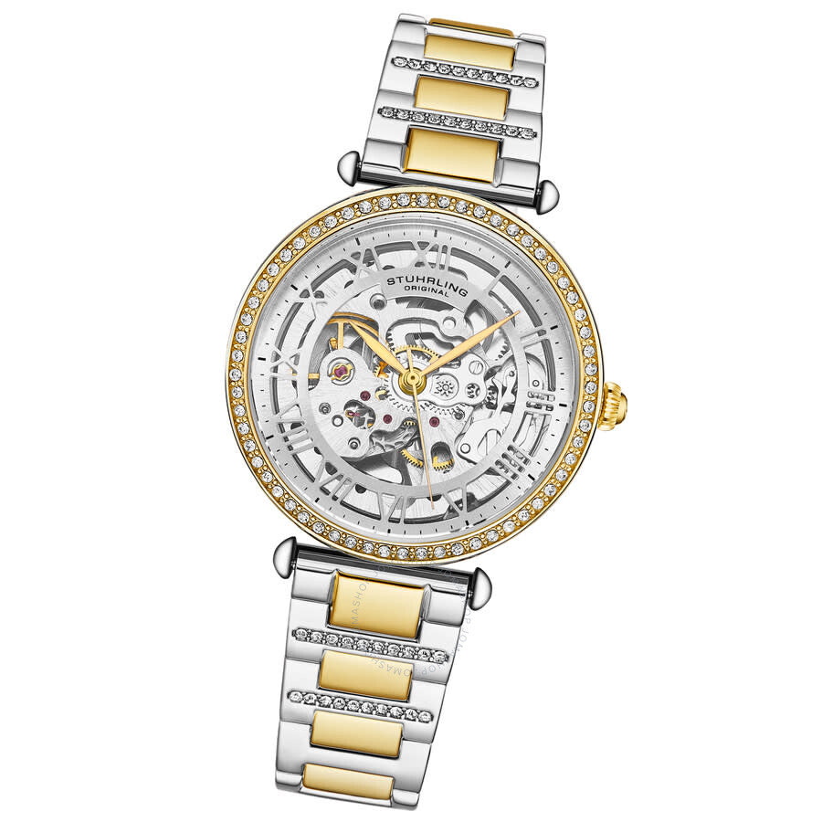 Womens Automatic Skeleton Two Tone YG /silver stainless steel band with stones Rose Gold Alloy case Silver-tone alloy case with a two-tone (silver-tone and yellow gold-tone) stainless steel bracelet. Fixed yellow gold-tone alloy bezel. Silver-tone dial with yellow gold-tone hands and Roman numeral hour markers. Minute markers around the outer rim. Dial Type: Analog. Automatic movement. Round case shape, case size: 45 mm, case thickness: 13.6 mm. Band width: 18 mm. Fold over clasp with a safety release. Functions: hour, minute, second. Legacy Series. Dress watch style. Stuhrling Original Legacy Automatic Silver Dial Ladies Watch M17972.