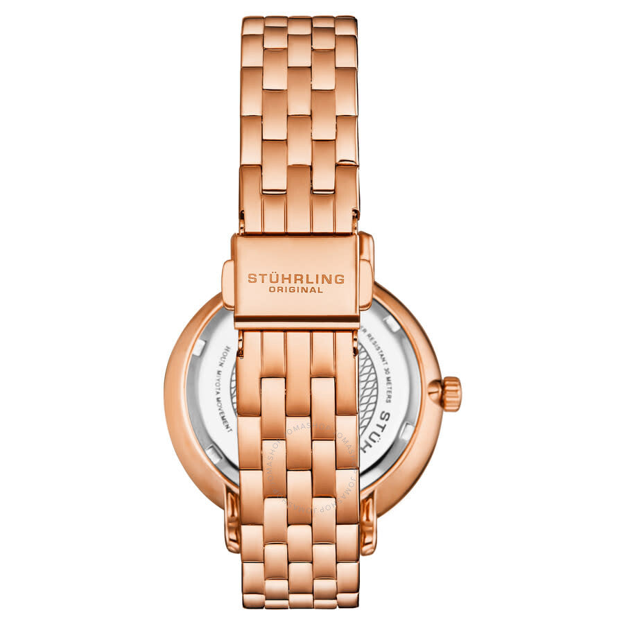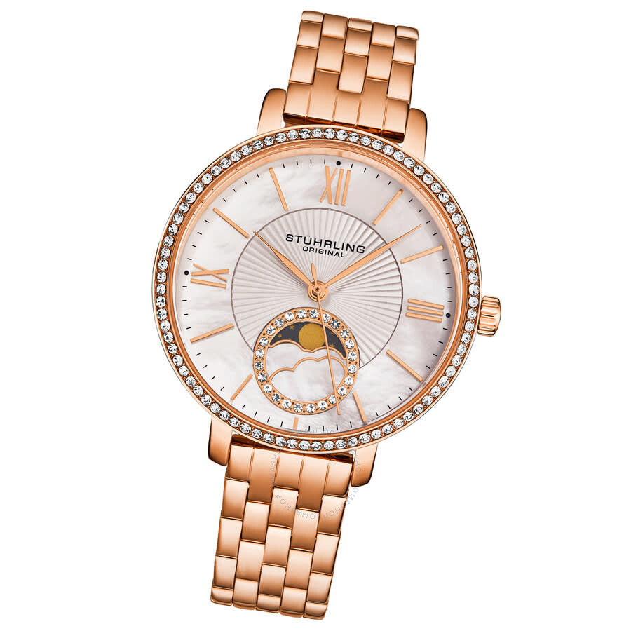 Women's Quartz Rose Alloy Case, Rose SS Link Bracelet Watch Moonphase Crystal Studded Bezel White Mother-of-Pearl Dial Rose gold-tone alloy case with a rose gold-tone stainless steel bracelet. Fixed rose gold-tone alloy bezel. Mother of pearl dial with rose gold-tone hands and index hour markers. Minute markers around the outer rim. Dial Type: Analog. Automatic movement. Round case shape, case size: 42 mm, case thickness: 10 mm. Band width: 14 mm. Fold over clasp with a safety release. Functions: hour, minute, second. Symphony Series. Dress watch style. Stuhrling Original Symphony Automatic Ladies Watch M17987.