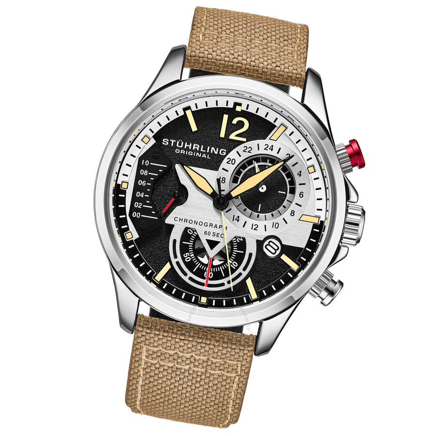Men's Chronograph, Silver Alloy Case, Black Dial, Beige Hands And Markers, Beige Genuine Fabric Covered Leather Strap Watch Silver-tone alloy case with a beige leather strap. Fixed silver-tone stainless steel bezel. Black dial with black hands and index hour markers. Minute markers around the outer rim. Dial Type: Analog. Date display at the 4 o'clock position. Quartz movement. Round case shape, case size: 45 mm, case thickness: 12.75 mm. Functions: date, hour, minute, second. Additional Info: luminous hands, luminous markers, chronograph. Aviator Series. Sport watch style. Stuhrling Original Aviator Quartz Black Dial Men's Watch M17973.