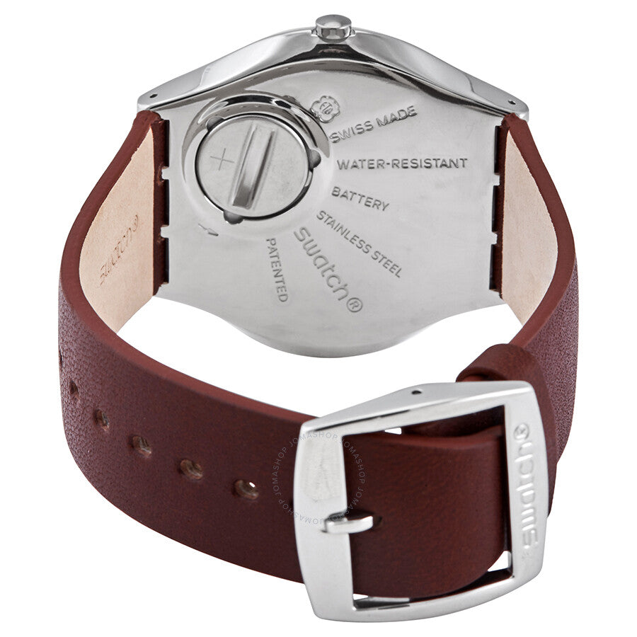 Stainless steel case with a brown leather strap. Fixed stainless steel bezel. Sun-brushed blue dial with luminous silver-tone hands and index hour markers. Arabic numerals mark the 3, 6, 9 and 12 o'clock positions. Minute markers around the outer rim. Dial Type: Analog. Luminescent hands. Quartz movement. Plexiglass crystal. Pull / push crown. Solid case back. Round case shape. Case size: 42 mm. Case thickness: 6.70 mm. Band width: 19 mm. Tang clasp. Water resistant at 30 meters / 100 feet. Functions: hour, minute. Casual watch style. Watch label: Swiss Made. Swatch SKINWIND Sun-brushed Blue Dial Men's Watch SS07S101.