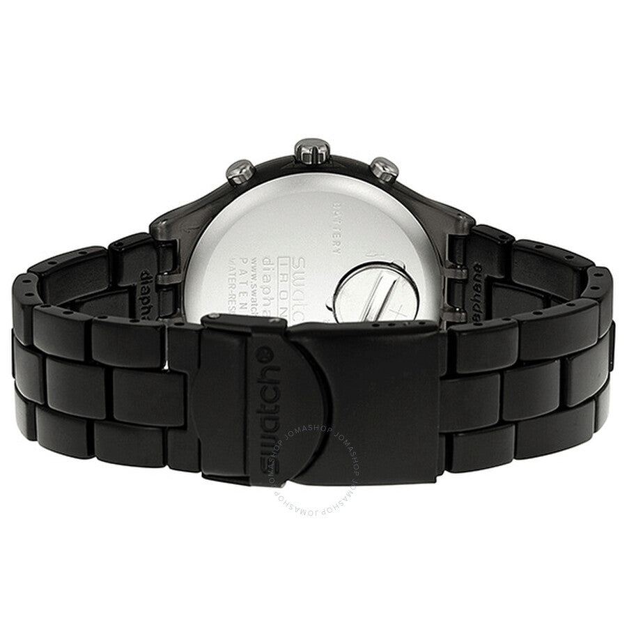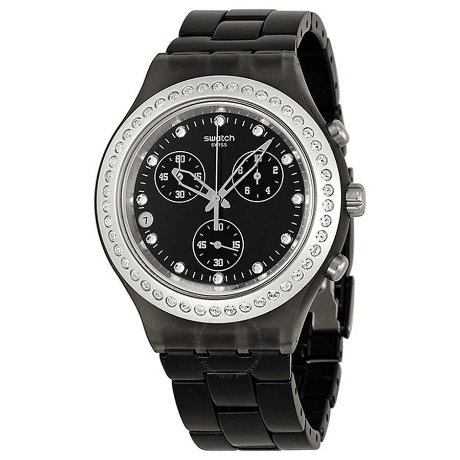 Black plastic case with a black aluminum bracelet. Fixed silver aluminium bezel set with clear crystals. Black dial with silver-tone skeleton hands and crystal hour markers. Minute markers around the outer rim. Dial Type: Analog. Date display between the 8 and 9 o'clock positions. Chronograph - three sub-dials displaying: 60 second, 60 minute and 1/10th of a second. Quartz movement. Scratch resistant mineral crystal. Pull / push crown. Solid case back. Round case shape. Case dimensions: 50.60 mm x 43.10 mm. Case thickness: 12.8 mm. Band width: 22 mm. Fold over clasp with a safety release. Water resistant at 30 meters / 100 feet. Functions: chronograph, date, hour, minute, second. Dress watch style. Watch label: Swiss Made. Swatch Irony Diaphane Full Blooded Stoneheart Silver Black Dial Chronograph Unisex Watch SVCM4009AG.