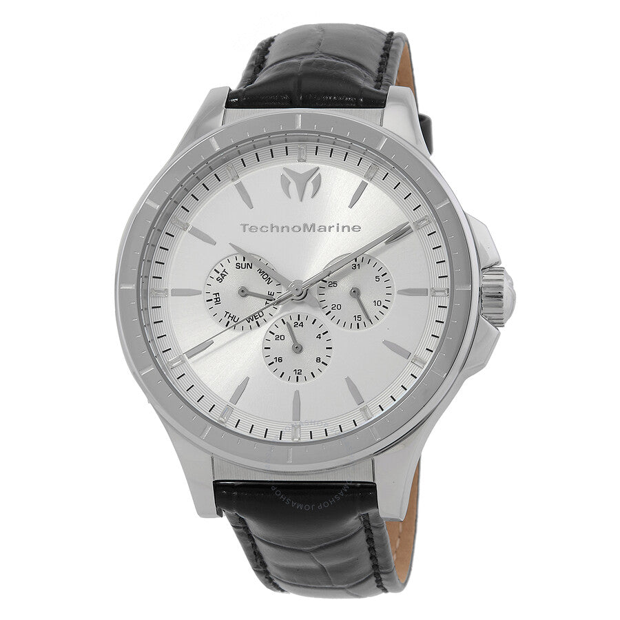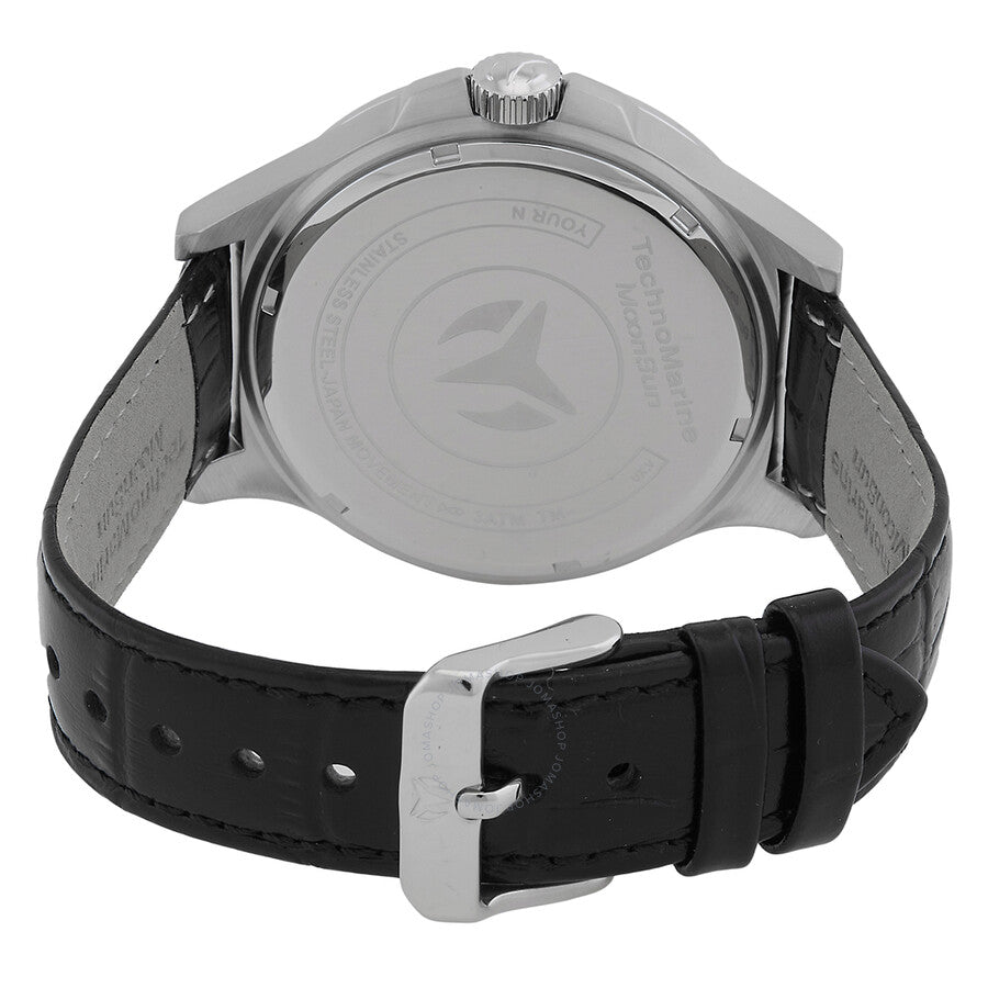 Silver-tone stainless steel case with a black leather strap. Fixed silver-tone stainless steel bezel. Silver-tone dial with silver-tone hands and index hour markers. Minute markers around the outer rim. Dial Type: Analog. Date display at the 3 o'clock position. Three sub-dials displaying: date, day and 24 hour. VH63 quartz movement. Scratch resistant mineral crystal. Pull / push crown. Solid case back. Round case shape, case size: 45 mm, case thickness: 11.00 mm. Band width: 20 mm, band length: 8.50 inches. Buckle clasp. Water resistant at 30 meters / 100 feet. Functions: date, day, second time zone, hour, minute, second. Moonsun Series. Casual watch style. Watch label: Japan Movt. Technomarine MoonSun Date-Day Quartz Silver Dial Men's Watch TM-822025.