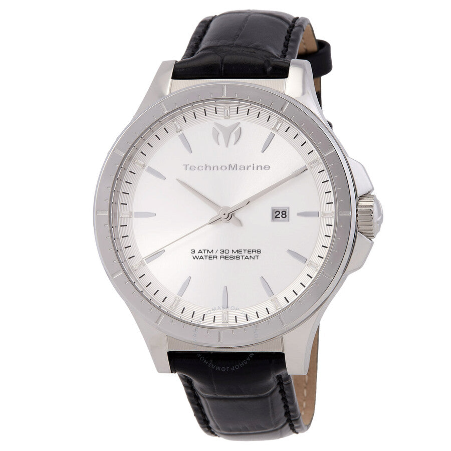 Silver-tone stainless steel case with a black leather strap. Fixed silver-tone stainless steel bezel. Silver-tone dial with silver-tone hands and index hour markers. Minute markers around the outer rim. Dial Type: Analog. Date display at the 3 o'clock position. PC32 quartz movement. Scratch resistant mineral crystal. Pull / push crown. Solid case back. Round case shape, case size: 45 mm, case thickness: 11.00 mm. Band width: 20 mm, band length: 8.50 inches. Buckle clasp. Water resistant at 30 meters / 100 feet. Functions: date, hour, minute, second. Moonsun Series. Casual watch style. Watch label: Japan Movt. Technomarine MoonSun Date Quartz Silver Dial Men's Watch TM-822010.