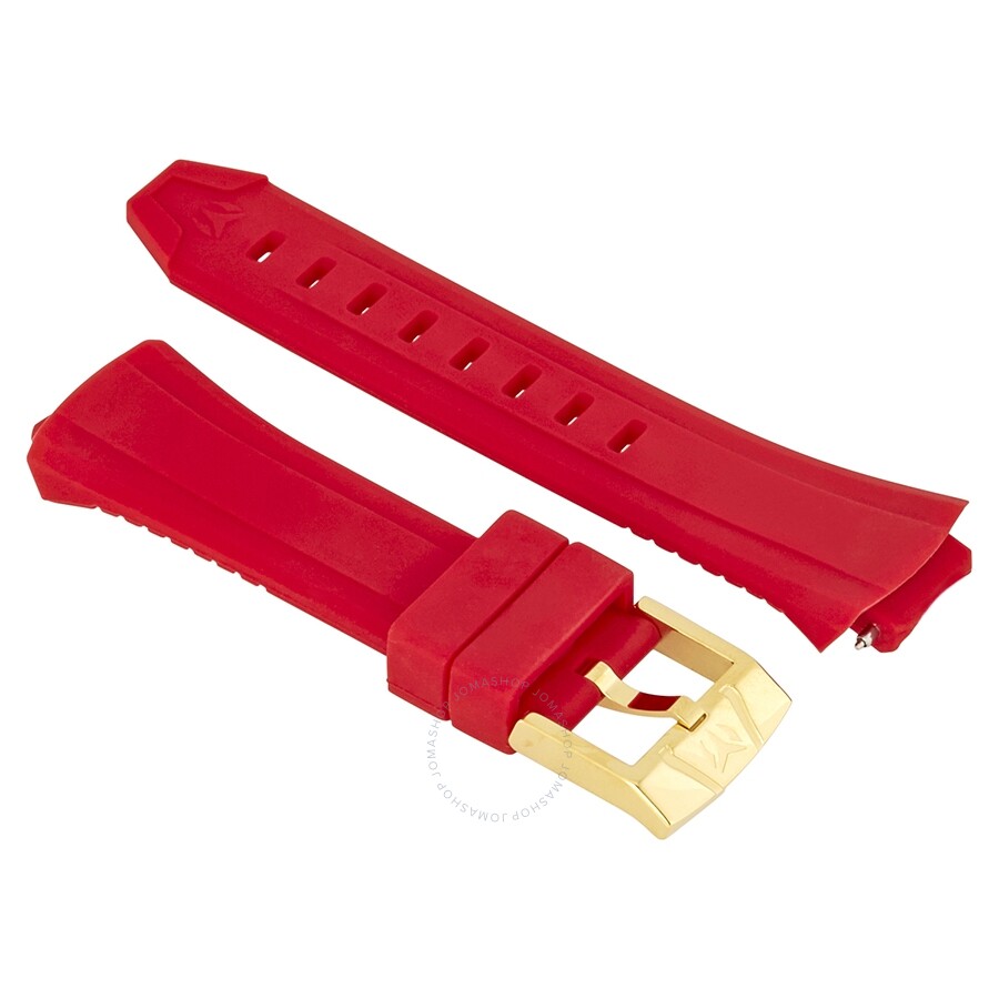 14kt gold PVD stainless steel case with a red leather strap. Uni-directional rotating 14kt gold PVD bezel. White mother of pearl dial with luminous gold-tone hands and index hour markers. Arabic numeral minute markers (at 5 minute intervals). Minute markers around the outer rim. Dial Type: Analog. Luminescent hands. Date display at the 4 o'clock position. Chronograph - three sub-dials displaying: 60 second, 60 minute and 24 hour. Hattori caliber VD53 quartz movement. Scratch resistant Flame Fusion crystal. Screw down crown. Solid case back. Round case shape. Case size: 40 mm. Case thickness: 11 mm. Band width: 25 mm. Band length: 7 inches. Tang clasp. Water resistant at 200 meters / 660 feet. Functions: chronograph, date, hour, minute, second. Cruise Valentine Series. Dress watch style. Watch label: Japan Movt. Technomarine Cruise Valentine Chronograph Quartz White Mother of Pearl Dial Ladies Watch TM-117003.