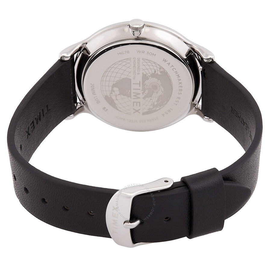 Silver-tone brass case with a black leather strap. Fixed silver-tone stainless steel bezel. White dial with silver-tone hands and Arabic numeral hour markers. Minute markers around the outer rim. Dial Type: Analog. Quartz movement. Scratch resistant mineral crystal. Pull / push crown. Solid case back. Round case shape, case size: 40 mm. Band width: 20 mm. Tang clasp. Water resistant at 30 meters / 100 feet. Functions: hour, minute, second. Essential Norway Series. Casual watch style. Timex Essential Norway Quartz White Dial Men's Watch TW2T66300.