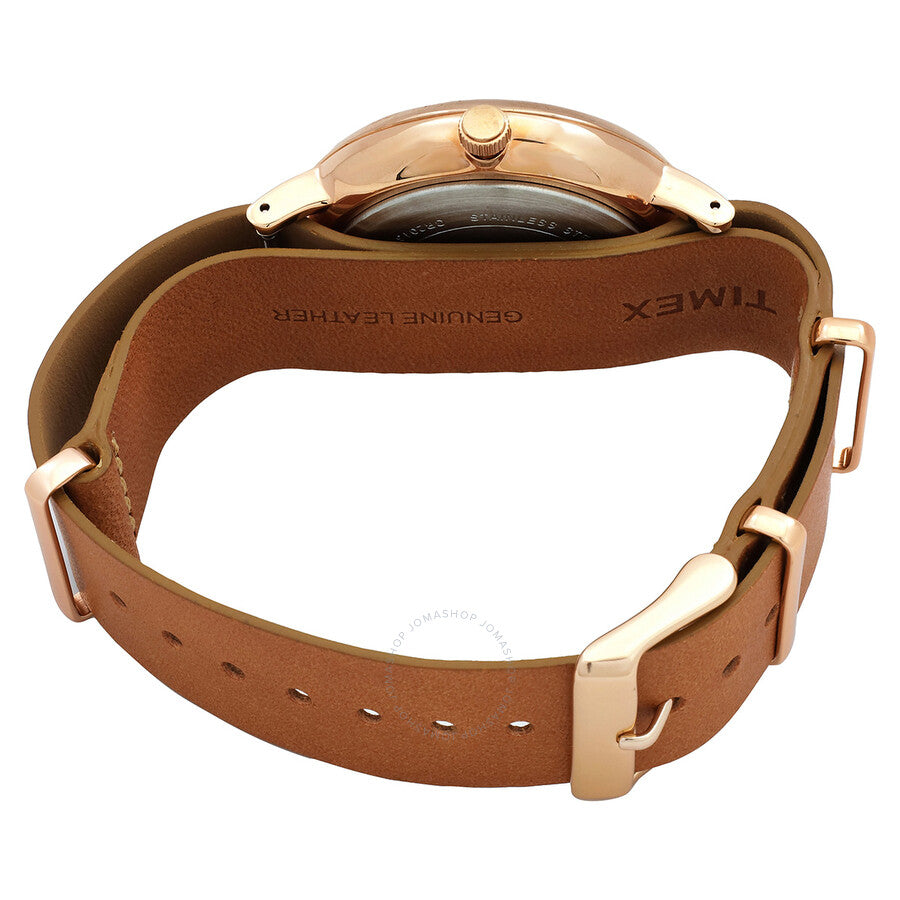 Rose gold-tone brass case with a brown leather strap. Fixed rose gold-tone brass bezel. White dial with rose gold-tone hands and index hour markers. Minute markers around the outer rim. Dial Type: Analog. Quartz movement. Scratch resistant mineral crystal. Pull / push crown. Solid case back. Round case shape. Case size: 41 mm. Case thickness: 8.5 mm. Band width: 20 mm. Tang clasp. Water resistant at 30 meters / 100 feet. Functions: hour, minute, second. Fairfield Series. Dress watch style. Timex Fairfield Quartz White Dial Unisex Watch TW2P91200.