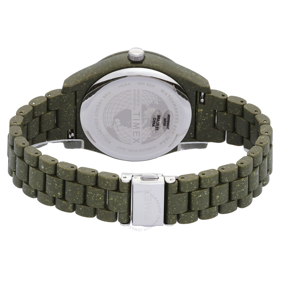 Green recycled plastic case and strap. Fixed green recycled plastic bezel. Black dial with silver-tone hands and index hour markers. Minute markers around the outer rim. Dial Type: Analog. Quartz movement. Scratch resistant mineral crystal. Pull / push crown. Solid case back. Round case shape, case size: 42 mm. Band width: 20 mm. Deployment clasp. Water resistant at 30 meters / 100 feet. Functions: hour, minute, second. Legacy Ocean Series. Casual watch style. Timex Legacy Ocean Quartz Black Dial Men's Watch TW2V77100JR.