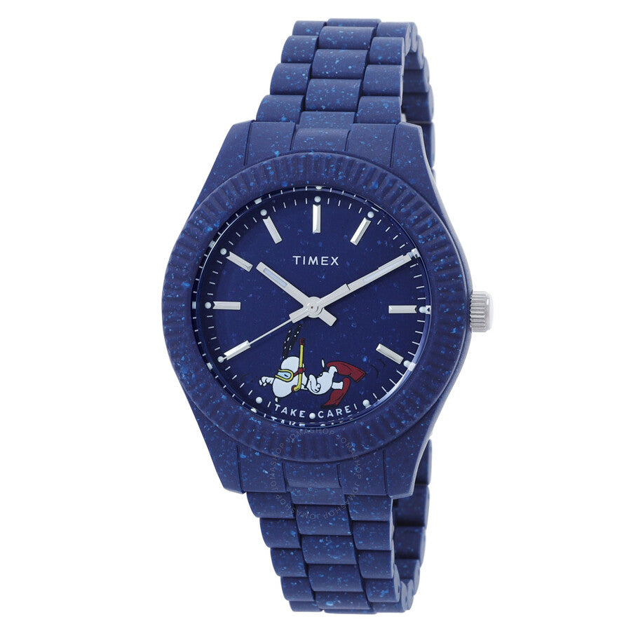 Blue plastic case and strap. Fixed blue plastic bezel. Blue dial with silver-tone hands and index hour markers. Minute markers around the outer rim. Dial Type: Analog. Quartz movement. Scratch resistant mineral crystal. Pull / push crown. Solid case back. Round case shape, case size: 41 mm. Band width: 20 mm. Deployment clasp. Water resistant at 30 meters / 100 feet. Functions: hour, minute, second. Peanuts Series. Casual watch style. Item Variations: TW2V53300JR. Timex Legacy Ocean X Peanuts Quartz Blue Dial Men's Watch TW2V53300.