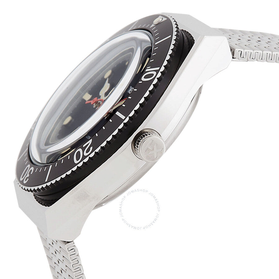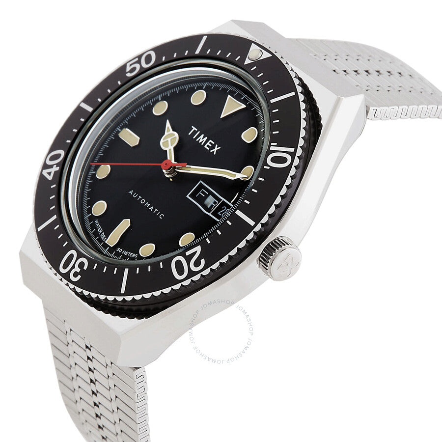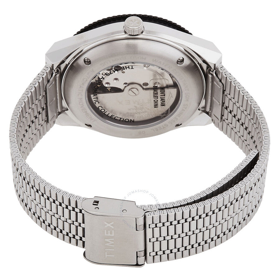 Silver-tone stainless steel case and bracelet. Uni-directional rotating black stainless steel bezel. Black dial with silver-tone hands and index hour markers. Minute markers around the outer rim. Dial Type: Analog. Luminescent hands and markers. Day of the week and date display at the 3 o'clock position. Automatic movement. Scratch resistant acrylic crystal. Transparent case back. Round case shape, case size: 40 mm, case thickness: 14.5 mm. Band width: 18 mm. Self-adjust clasp. Water resistant at 50 meters / 165 feet. Functions: date, day, hour, minute, second. M79 Series. Casual watch style. Timex M79 Automatic Black Dial Watch TW2U78300V3.