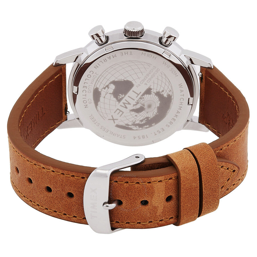 Silver-tone stainless steel case with a brown leather strap. Fixed silver-tone stainless steel bezel. Green dial with silver-tone hands and index-Arabic numeral hour markers. Minute markers around the outer rim. Dial Type: Analog. Date display between 4 and 5 o'clock position. Chronograph - three sub-dials displaying: 60 second, 60 minute and 24 hour. Quartz movement. Scratch resistant acrylic crystal. Pull / push crown. Solid case back. Round case shape, case size: 40 mm, case thickness: 13 mm. Band width: 20 mm. Buckle clasp. Water resistant at 50 meters / 165 feet. Functions: chronograph, date, hour, minute, second. Marlin Series. Sport watch style. Item Variations: TW2W10100VQ. Timex Marlin Chronograph Quartz Green Dial Men's Watch TW2W10100.