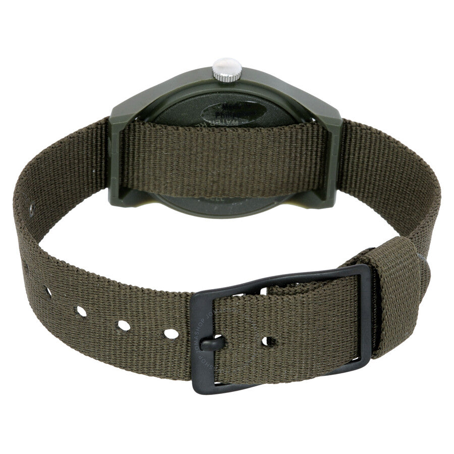 Green resin case with a green fabric strap. Fixed green stainless steel bezel. Black dial with silver-tone hands and Arabic numeral hour markers. Minute markers around the outer rim. 24 hour clock on the inner circle. Dial Type: Analog. Quartz movement. Scratch resistant mineral crystal. Pull / push crown. Solid case back. Round case shape, case size: 28 mm, case thickness: 9 mm. Band width: 14 mm. Tang clasp. Water resistant at 30 meters / 100 feet. Functions: hour, minute, second. MK1 Series. Casual watch style. Timex MK1 Quartz Black Dial Ladies Watch TW2T33700.