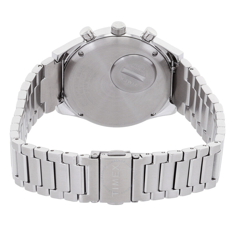 Silver-tone stainless steel case and bracelet. Fixed silver-tone stainless steel bezel. Blue dial with silver-tone hands and index hour markers. Minute markers around the outer rim. Dial Type: Analog. Date display between 4 and 5 o'clock position. Chronograph - three sub-dials displaying: 60 second, 60 minute and 24 hour. Quartz movement. Scratch resistant acrylic crystal. Pull / push crown. Solid case back. Round case shape, case size: 40 mm, case thickness: 12 mm. Band width: 18 mm. Deployment clasp. Water resistant at 50 meters / 165 feet. Functions: chronograph, date, hour, minute, second. Q Timex Falcon Eye Series. Sport watch style. Item Variations: TW2W33700VQ. Timex Q Falcon Eye Chronograph Quartz Blue Dial Men's Watch TW2W33700.