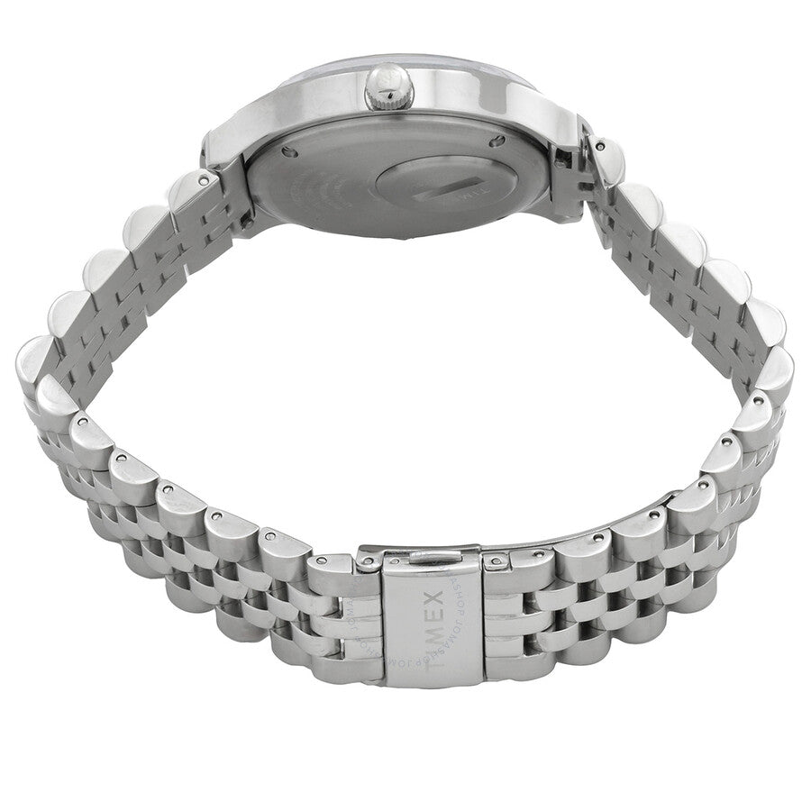 Silver-tone stainless steel case and bracelet. Fixed silver-tone stainless steel bezel. Degrade dial with index hour markers. Minute markers around the outer rim. Dial Type: Analog. Day of the week and date display at the 3 o'clock position. Quartz movement. Scratch resistant acrylic crystal. Pull / push crown. Solid case back. Round case shape, case size: 38 mm, case thickness: 9.5 mm. Band width: 20 mm. Fold over clasp. Water resistant at 50 meters / 165 feet. Functions: date, day, hour, minute, second. Q Timex Series. Casual watch style. Item Variations: TW2W22500VQ. Timex Q Reissue Degrade Quartz Men's Watch TW2W22500.