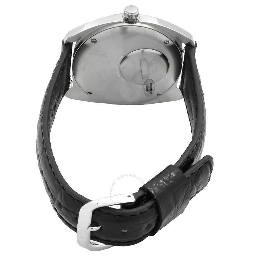 Silver-tone stainless steel case with a black leather strap. Fixed silver-tone stainless steel bezel. Green dial with silver-tone hands and index hour markers. Minute markers around the outer rim. Dial Type: Analog. Day of the week and date display at the 3 o'clock position. Quartz movement. Scratch resistant acrylic crystal. Pull / push crown. Solid case back. Round case shape, case size: 37.5 mm, case thickness: 13 mm. Band width: 20 mm. Buckle clasp. Water resistant at 50 meters / 165 feet. Functions: date, day, hour, minute, second. Q Timex Series. Casual watch style. Item Variations: TW2W44700ZV. Timex Q Timex 1978 Quartz Green Dial Men's Watch TW2W44700.