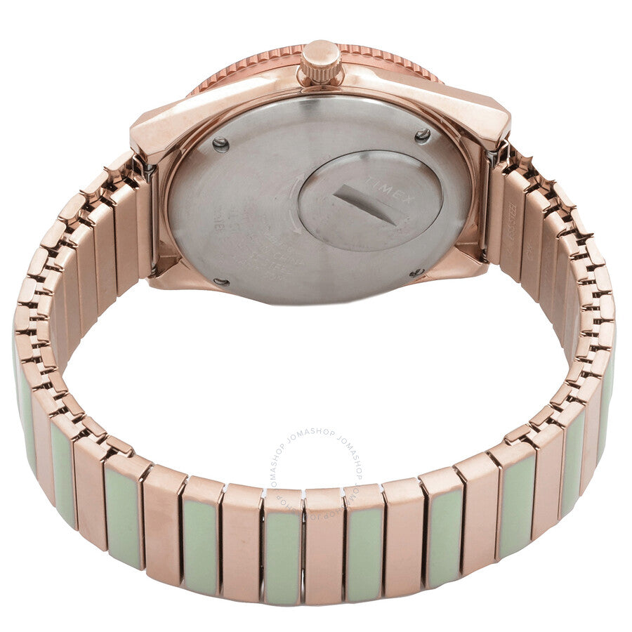 Rose gold-tone stainless steel case with a two-tone (green and rose gold-tone) stainless steel bracelet. Rotating two-tone (green and rose gold-tone) stainless steel bezel. Green dial with rose gold-tone hands and index hour markers. Minute markers around the outer rim. Dial Type: Analog. Day of the week and date display at the 3 o'clock position. Quartz movement. Scratch resistant acrylic crystal. Pull / push crown. Solid case back. Round case shape, case size: 36 mm, case thickness: 12 mm. Band width: 16 mm. Expansion clasp. Water resistant at 50 meters / 165 feet. Functions: date, day, hour, minute, second. Q Timex Malibu Series. Timex Q Timex Malibu Quartz Green Dial Ladies Watch TW2V38700VQ.