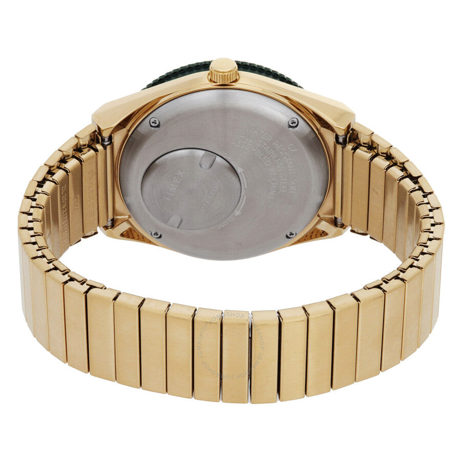 Gold-tone stainless steel case and bracelet. Rotating green stainless steel bezel. Green malachite dial with gold-tone hands and index hour markers. Minute markers around the outer rim. Dial Type: Analog. Quartz movement. Scratch resistant acrylic crystal. Pull / push crown. Solid case back. Round case shape, case size: 36 mm, case thickness: 12 mm. Band width: 16 mm. Expansion clasp. Water resistant at 50 meters / 165 feet. Functions: hour, minute, second. Q Timex Series. Casual watch style. Timex Q Timex Quartz Green Malachite Dial Ladies Watch TW2V92200VQ.