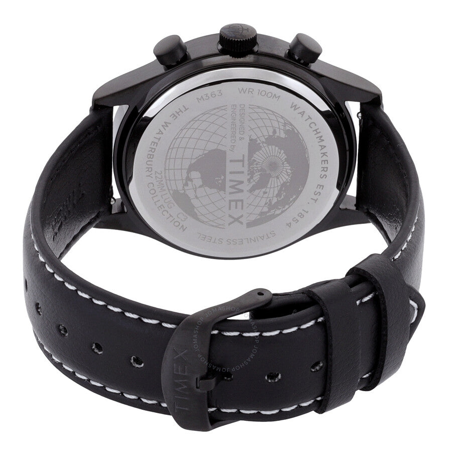 Black stainless steel case with a black leather strap. Fixed black stainless steel bezel. Black dial with silver-tone hands and Arabic numeral hour markers. Minute markers around the outer rim. Dial Type: Analog. Date display between 2 and 3 o'clock position. Chronograph - two sub-dials displaying: second time zone indicator and chrono counter. Quartz movement. Scratch resistant mineral crystal. Solid case back. Round case shape, case size: 43 mm, case thickness: 12 mm. Band width: 22 mm. Buckle clasp. Water resistant at 100 meters / 330 feet. Functions: chronograph, GMT, second time zone, date, hour, minute, second. Waterbury Series. Sport watch style. Item Variations: TW2W48000VQ. Timex Waterbury Chronograph GMT Quartz Black Dial Men's Watch TW2W48000.