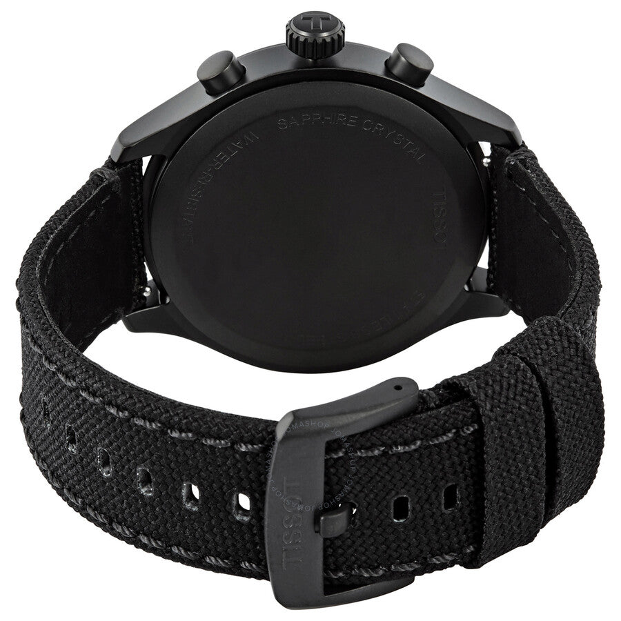 Black PVD stainless steel case with a black nylon strap. Fixed black PVD bezel. Black dial with luminous black hands and Arabic numeral hour markers. Minute markers around the outer rim. Dial Type: Analog. Luminescent hands and markers. Date display at the 4 o'clock position. Chronograph - three sub-dials displaying: 60 second, 30 minute and 1/10th of a second. Quartz movement. Scratch resistant sapphire crystal. Pull / push crown. Solid case back. Round case shape. Case size: 45 mm. Case thickness: 11.02 mm. Band width: 22 mm. Tang clasp. Water resistant at 100 meters / 330 feet. Functions: chronograph, date, hour, minute, second. Casual watch style. Watch label: Swiss Made. Tissot Quartz Black Dial Watch T1166173705100.