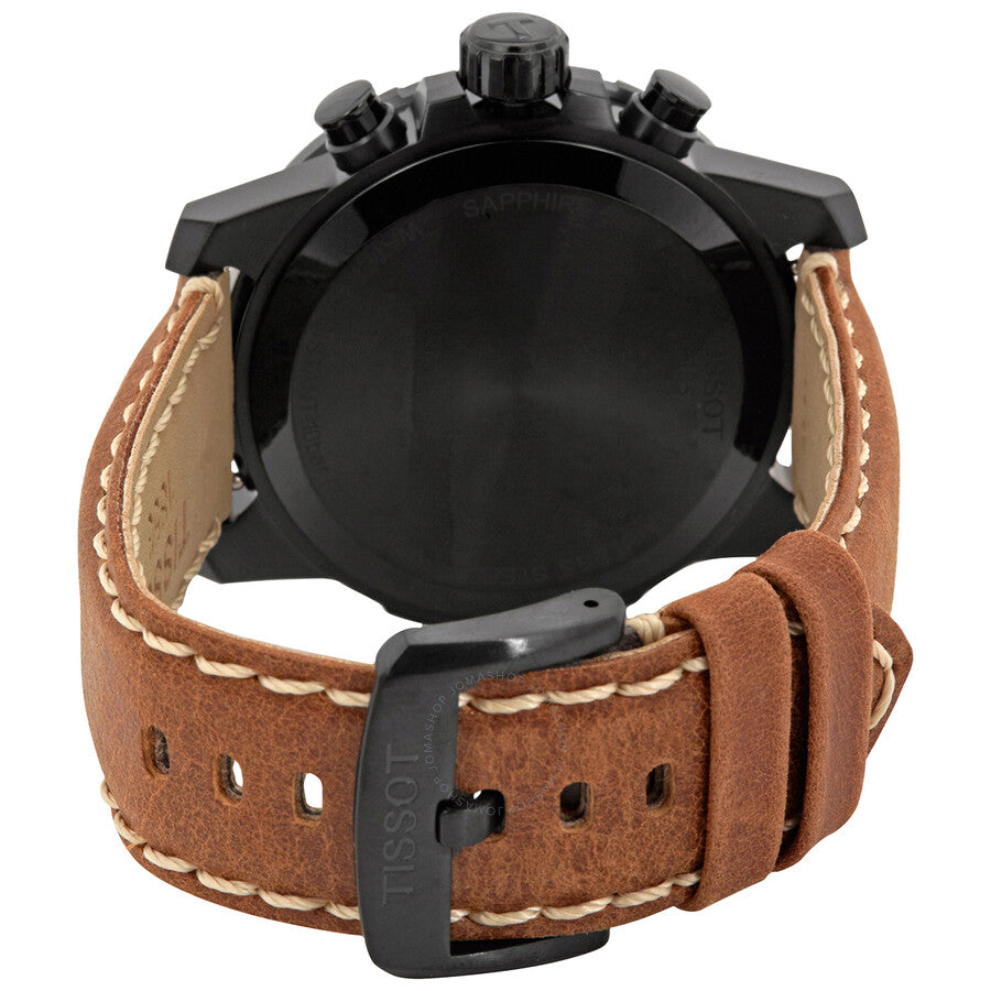 Black-plated stainless steel case with a brown leather strap. Fixed black-plated stainless steel bezel with a black aluminium ring showing tachymeter markings. Black dial with luminous black hands and index hour markers. Minute markers around the outer rim. Dial Type: Analog. Luminescent hands and markers. Date display at the 6 o'clock position. Chronograph - three sub-dials displaying: 60 second, 30 minute and 1/10th of a second. ETA caliber G10.212 quartz movement. Scratch resistant sapphire crystal. Pull / push crown. Solid case back. Round case shape. Case size: 45.5 mm. Case thickness: 11.9 mm. Band width: 22 mm. Tang clasp. Water resistant at 100 meters / 330 feet. Functions: chronograph, rattrapante, date, hour, minute, small second. Supersport Series. Sport watch style. Watch label: Swiss Made. Tissot Supersport Chronograph Quartz Black Dial Men's Watch T125.617.36.051.01.
