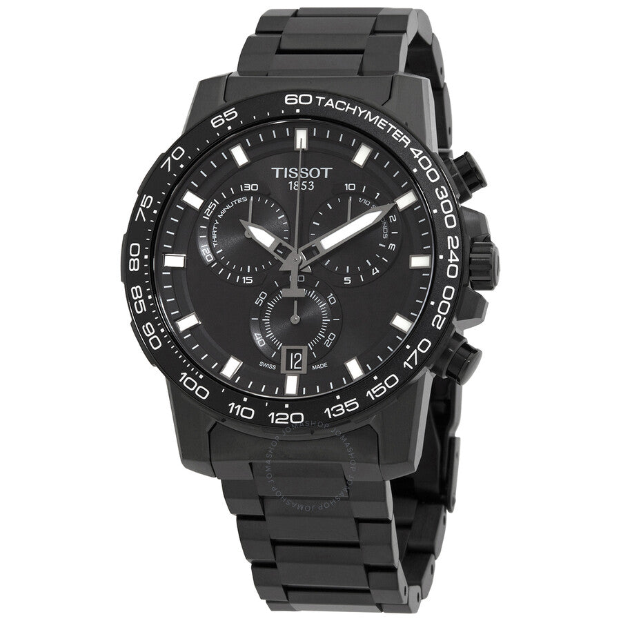 Black PVD 316L stainless steel case with a black PVD stainless steel bracelet. Fixed black PVD bezel with a black aluminium top ring. Black dial with luminous black hands and index hour markers. Minute markers around the outer rim. Tachymeter scale. Dial Type: Analog. Luminescent hands and markers. Date display at the 6 o'clock position. Chronograph - three sub-dials displaying: 60 second, 30 minute and 1/10th of a second. ETA Caliber G10.212 quartz movement. Scratch resistant sapphire crystal. Solid case back. Round case shape. Case size: 45.5 mm. Case thickness: 11.9 mm. Band width: 22 mm. Fold over clasp with a safety release. Water resistant at 100 meters / 330 feet. Functions: chronograph, rattrapante, date, hour, minute, small second. T-sport Series. Sport watch style. Watch label: Swiss Made. Tissot T-Sport Chronograph Quartz Black Dial Men's Watch T125.617.33.051.00.