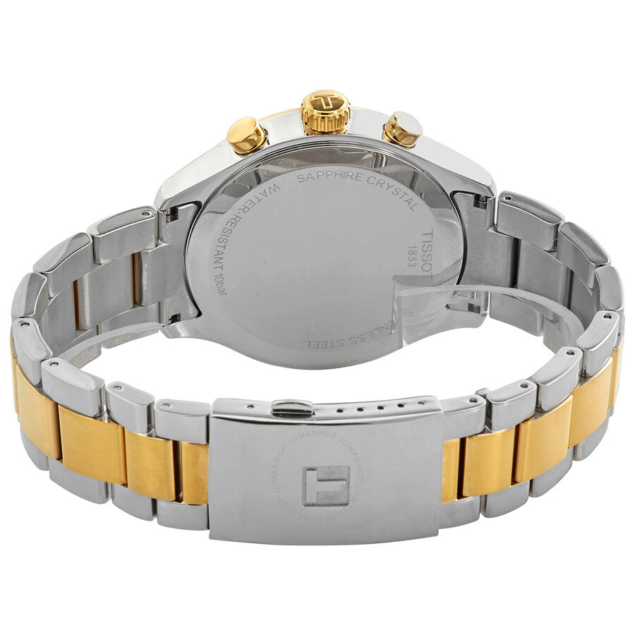 Stainless steel case with a two-tone (silver-tone and yellow gold PVD) stainless steel bracelet. Fixed yellow gold PVD bezel. Green dial with gold-tone hands and index hour markers. Minute markers around the outer rim. Dial Type: Analog. Luminescent hands and markers. Date display at the 4 o'clock position. Chronograph - three sub-dials displaying: 60 second, 30 minute and 1/10th of a second. ETA caliber G10.212 quartz movement. Scratch resistant sapphire crystal. Solid case back. Round case shape. Case size: 45 mm. Case thickness: 11 mm. Band width: 22 mm. Fold over clasp with a safety release. Water resistant at 100 meters / 330 feet. Functions: chronograph, rattrapante, date, hour, minute, small second. T-sport Series. Sport watch style. Watch label: Swiss Made. Tissot T-Sport Chronograph Quartz Green Dial Men's Watch T116.617.22.091.00.