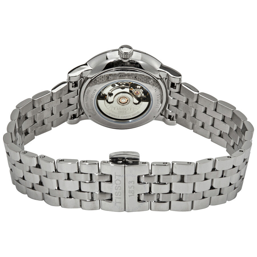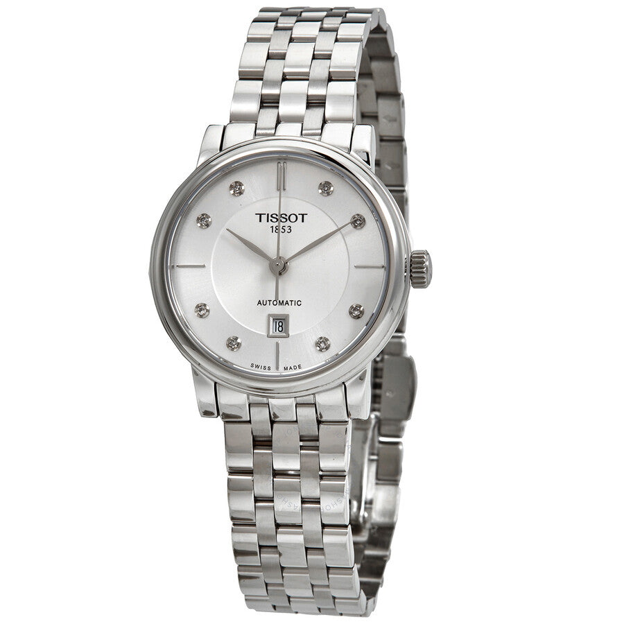 Stainless steel case with a stainless steel bracelet. Fixed stainless steel bezel. White dial with silver-tone leaf-style hands and diamond hour markers. Index markers at the 3, 6, 9 and 12 o'clock positions. Dial Type: Analog. Date display above the 6 o'clock position. ETA caliber 2671 automatic movement, containing 25 Jewels, bitting at 28800 vph, and has a power reserve of approximately 38 hours. Scratch resistant sapphire crystal. Pull / push crown. Transparent case back. Round case shape. Case size: 30 mm. Case thickness: 9.48 mm. Band width: 15 mm. Butterfly clasp. Water resistant at 50 meters / 165 feet. Functions: date, hour, minute, second. Dress watch style. Watch label: Swiss Made. Tissot Carson Premium Automatic Diamond White Dial Ladies Watch T122.207.11.036.00.