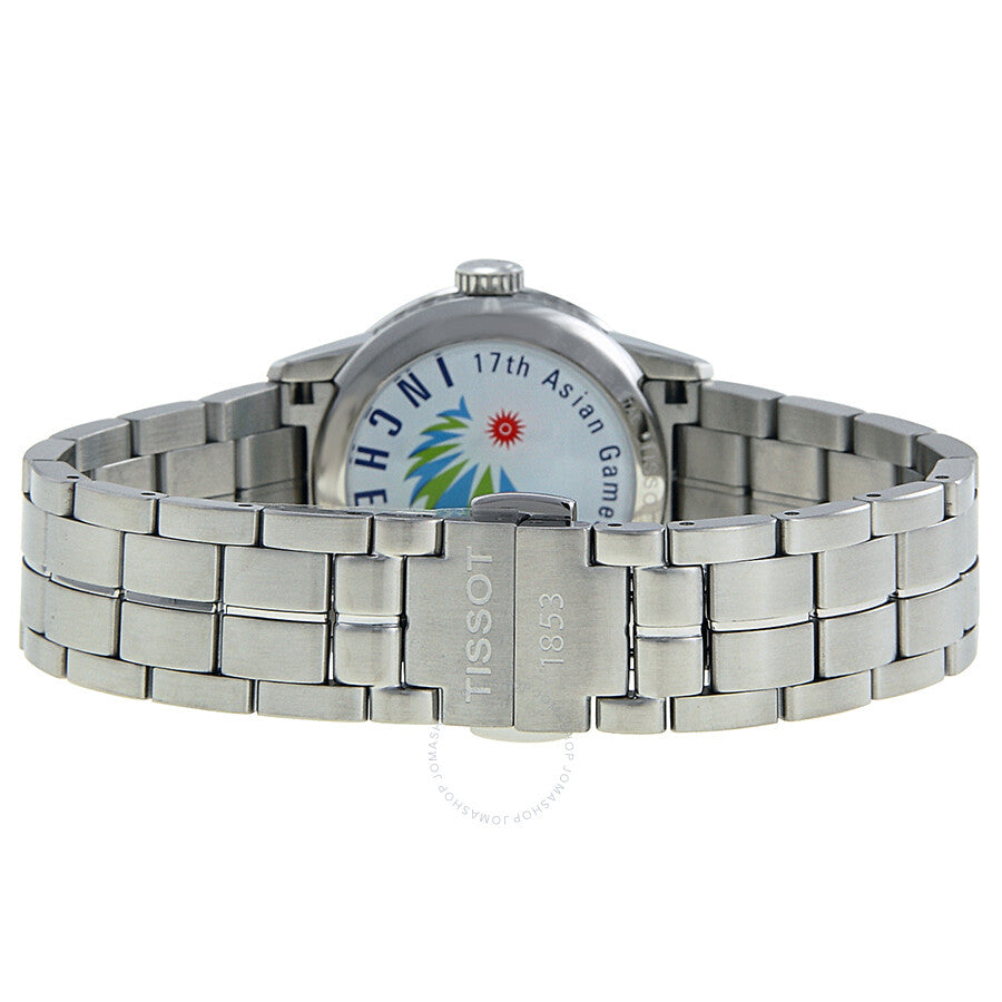 Stainless steel case with a stainless steel bracelet. Fixed stainless steel bezel. Mother of pearl dial with silver-tone hands and index hour markers. Minute markers around the outer rim. Dial Type: Analog. Date display at the 3 o'clock position. Automatic movement. Powermatic 80 engine. Scratch resistant sapphire crystal. Solid (Asian Games logo) case back. Case diameter: 33 mm. Case thickness: 10 mm. Round case shape. Butterfly clasp. Water resistant at 50 meters / 165 feet. Functions: date, hour, minute, second. Casual watch style. Tissot Luxury Asian Games Automatic Mother of Pearl Dial Stainless Steel Ladies Watch T0862071111101.