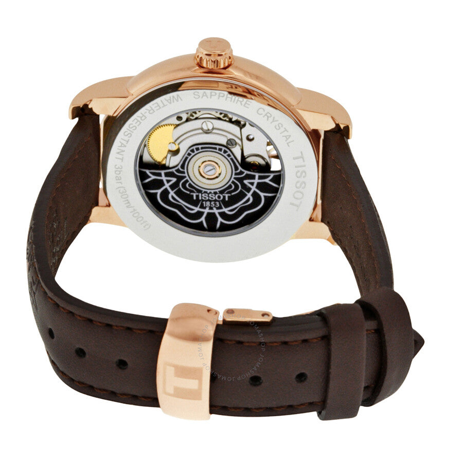 Rose gold PVD stainless steel case with a brown leather strap. Fixed rose gold PVD bezel. Mother of pearl (brown center) dial with rose gold-tone alpha-style hands and index hour markers. Arabic numerals mark the 3, 6 and 9 o'clock positions. Dial Type: Analog. Tissot calibre Powermatic 80.601 automatic movement, based upon Tissot calibre Powermatic 80, containing 23 Jewels, bitting at 21600 vph, and has a power reserve of approximately 80 hours. Scratch resistant sapphire crystal. Pull / push crown. Solid case back. Round case shape. Case size: 35 mm. Case thickness: 9.35 mm. Band width: 16 mm. Band length: 8 inches. Tang clasp. Water resistant at 30 meters / 100 feet. Functions: hour, minute, second. Dress watch style. Watch label: Swiss Made. Tissot T-Classic Lady Heart Automatic Ladies Watch T0502073711704.