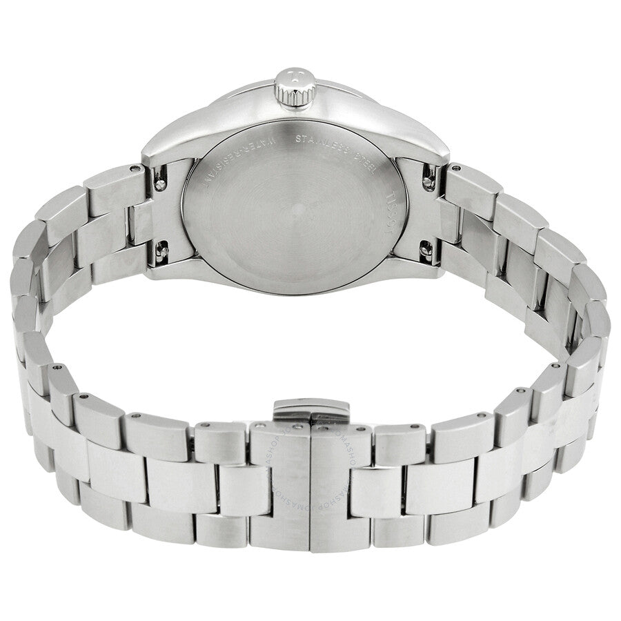 Silver-tone 316L stainless steel case with a silver-tone stainless steel bracelet. Fixed silver-tone stainless steel bezel. Mother of pearl dial with rose gold-tone hands and index hour markers. Minute markers around the outer rim. Dial Type: Analog. Date display at the 3 o'clock position. ETA Caliber F03.111 quartz movement. Scratch resistant sapphire crystal. Solid case back. Round case shape, case size: 29.3 mm, case thickness: 9.7 mm. Band width: 15 mm. Fold over clasp with a safety release. Water resistant at 100 meters / 330 feet. Functions: date, hour, minute, second, battery eol indicator. T-my Lady Series. Casual watch style. Watch label: Swiss Made. Tissot T-MY Lady Quartz Mother of Pearl Dial Ladies Watch T132.010.11.111.00.