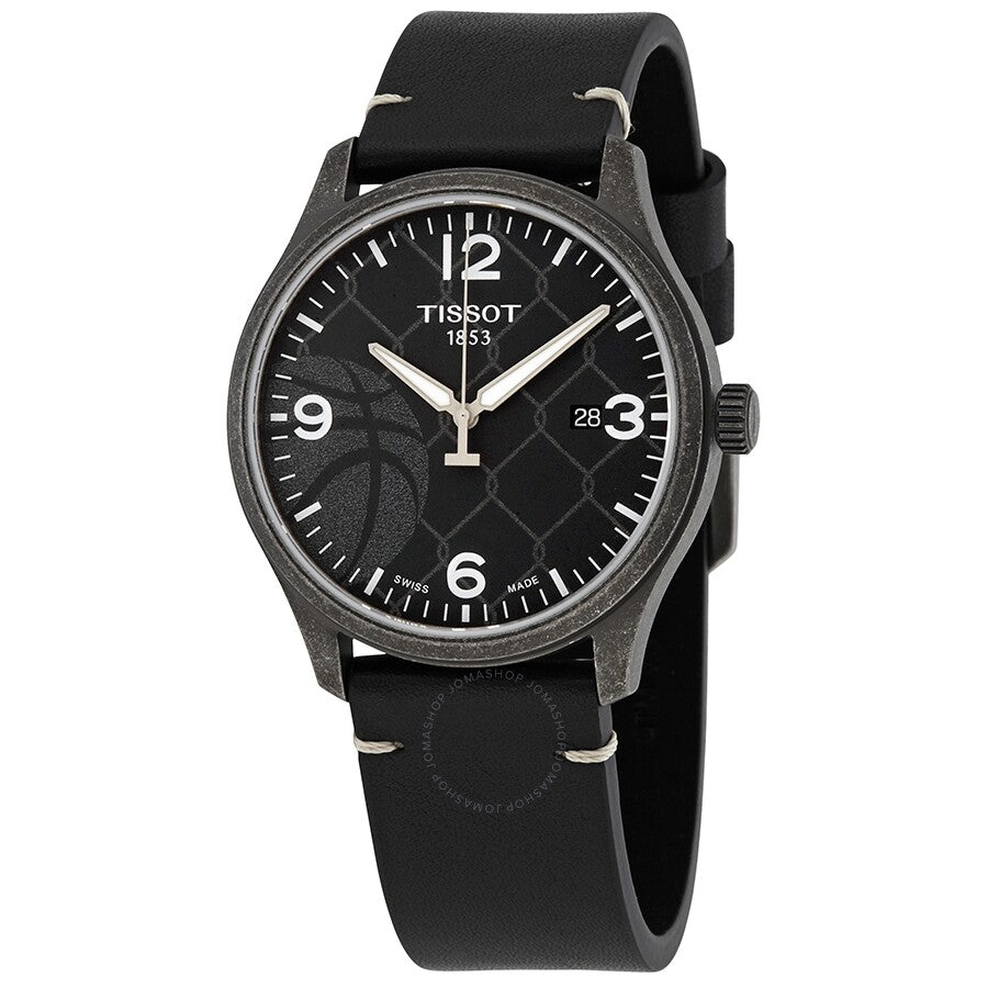 Antique PVD stainless steel case with a black leather strap. Fixed antique PVD bezel. Anthracite dial with luminoius silver-tone alpha-style shape hands and index hour markers. Arabic numerals mark the 3, 6, 9 and 12 o'clock positions. Minute markers around the outer rim. Dial Type: Analog. Luminescent hands and markers. Date display at the 3 o'clock position. ETA caliber F06.115 quartz movement. Scratch resistant sapphire crystal. Pull / push crown. Solid case back. Round case shape. Case size: 42 mm. Case thickness: 8.9 mm. Band width: 22 mm. Tang clasp. Water resistant at 100 meters / 330 feet. Functions: date, hour, minute, second. Casual watch style. Watch label: Swiss Made. Tissot 3x3 Street Basketball Quartz Men's Watch T116.410.36.067.00.
