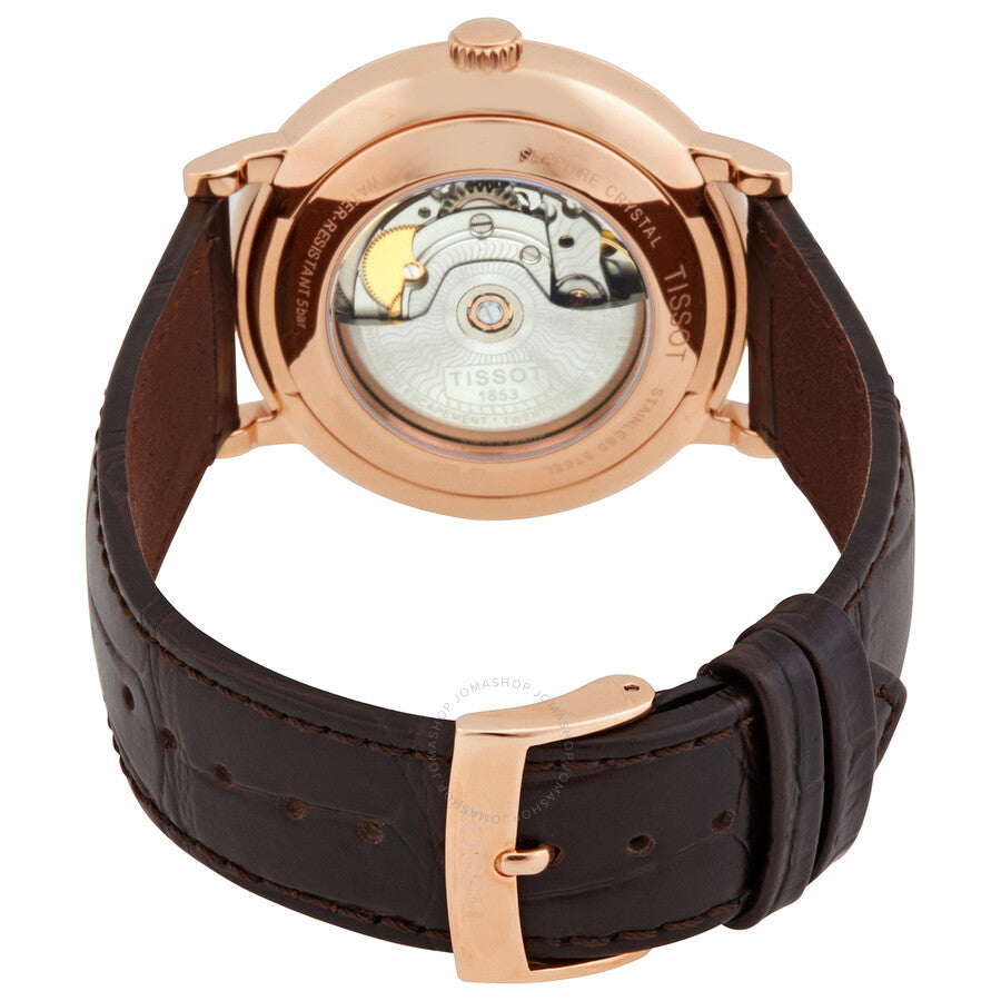 Rose gold PVD stainless steel case with a brown leather strap. Fixed rose gold PVD bezel. Silver dial with black hands and Roman numeral hour markers. Dial Type: Analog. Date display above the 6 o'clock position. Powermatic 80.111 automatic movement, containing 23 Jewels, bitting at 28800 vph, and has a power reserve of approximately 80 hours. Scratch resistant sapphire crystal. Pull / push crown. Transparent case back. Round case shape. Case size: 40 mm. Case thickness: 10.3 mm. Band width: 20 mm. Tang clasp. Water resistant at 50 meters / 165 feet. Functions: date, hour, minute, second. Carson Series. Casual watch style. Watch label: Swiss Made. Tissot Carson Automatic Silver Dial Men's Watch T122.407.36.033.00.