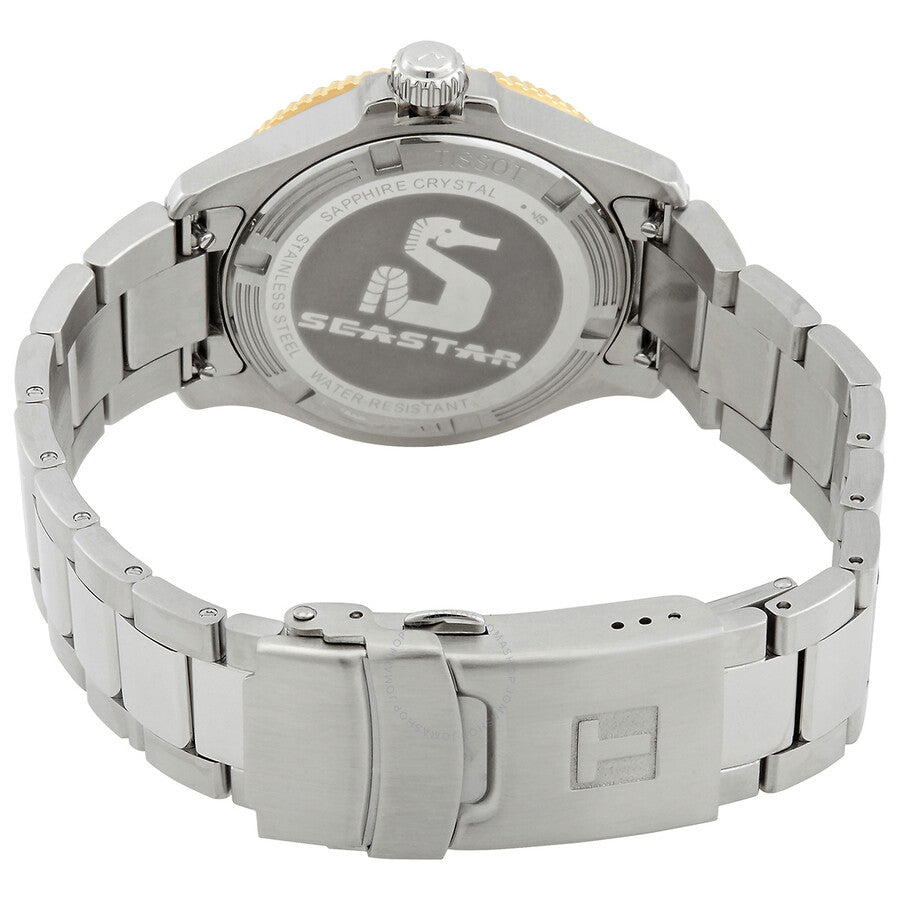 Stainless steel case with a stainless steel bracelet. Uni-directional rotating yellow gold PVD bezel with an inlaid black ring. Black dial with luminous gold-tone hands and dot hour markers. Minute markers around the outer rim. Dial Type: Analog. Luminescent hands and markers. Date display at the 6 o'clock position. Quartz movement. Scratch resistant sapphire crystal. Screw down crown. Solid case back. Round case shape. Case size: 36 mm. Case thickness: 9.7 mm. Band width: 18 mm. Fold over clasp with a safety release. Water resistant at 300 meters / 1000 feet. Functions: date, hour, minute, second. Seastar 1000 Series. Sport watch style. Watch label: Swiss Made. Tissot Seastar 1000 Quartz Black Dial Unisex Watch T1202102105100.