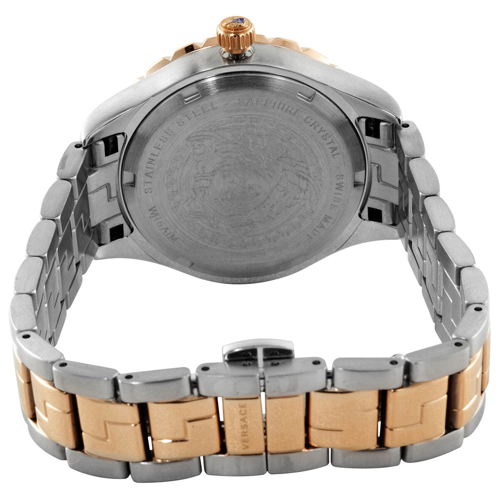 Stainless steel case with a two-tone (silver-tone and rose gold PVD) stainless steel bracelet. Fixed (Greca pattern) rose gold PVD bezel. Blue dial with luminous rose gold-tone hands and index / Roman numeral hour markers. Minute markers around the outer rim. The Medusa Head logo appears at the 12 o'clock position. Dial Type: Analog. Luminescent hands and markers. Date display at the 3 o'clock position. Quartz movement. Scratch resistant sapphire crystal. Pull / push crown. Solid case back. Round case shape, case size: 35 mm, case thickness: 10 mm. Band width: 18 mm. Deployment clasp. Water resistant at 30 meters / 100 feet. Functions: date, hour, minute, second. Hellenyium Series. Casual watch style. Watch label: Swiss Made. Versace Hellenyium Quartz Blue Dial Ladies Watch V12060017.