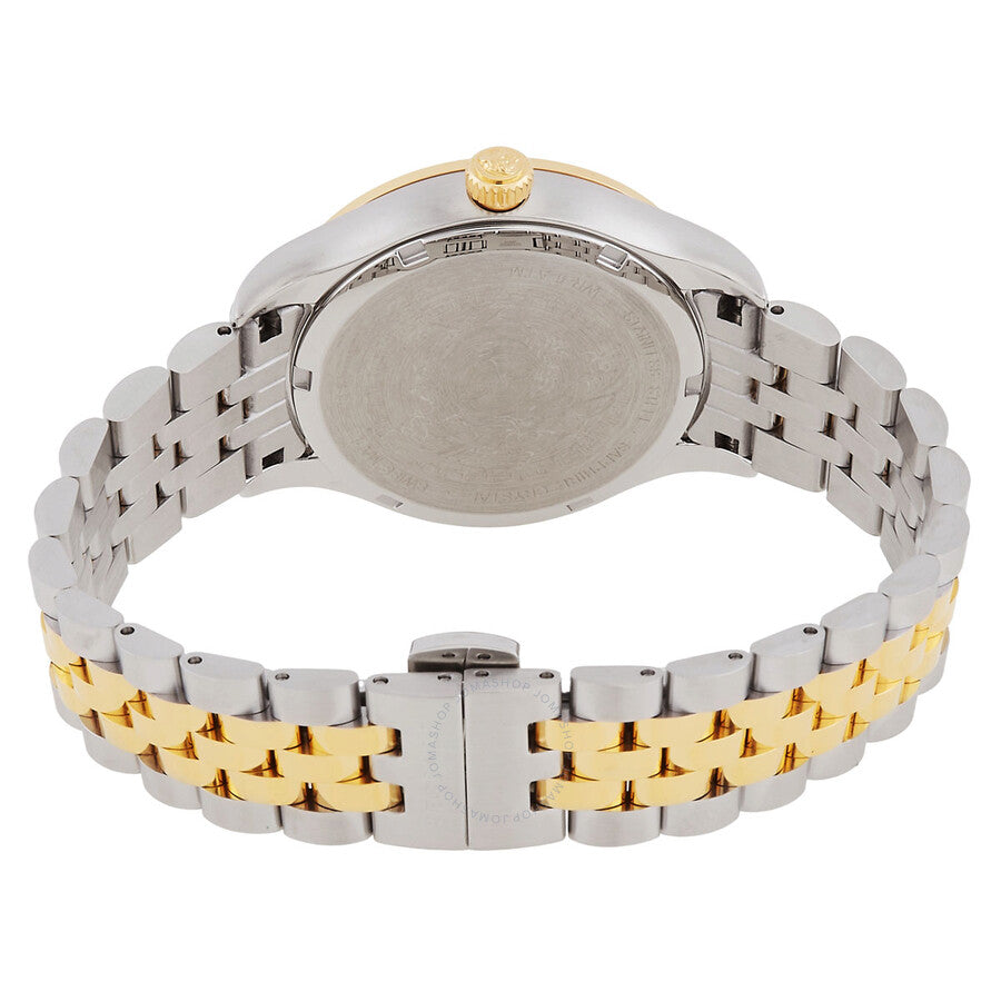 Silver-tone stainless steel case with a two-tone (silver-tone and gold-tone) stainless steel bracelet. Fixed gold-tone stainless steel bezel. Blue dial with gold-tone hands and index-Roman numeral hour markers. Medusa head marks the 12 o'clock position. Dial Type: Analog. Quartz movement. Scratch resistant sapphire crystal. Pull / push crown. Solid case back. Round case shape, case size: 35 mm. Deployment with push button release clasp. Water resistant at 50 meters / 165 feet. Functions: hour, minute. Hellenyium Series. Dress watch style. Watch label: Swiss Made. Versace Hellenyium Quartz Blue Dial Two-Tone Ladies Watch VE2S00522.