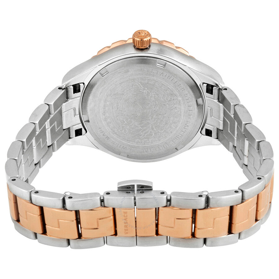Stainless steel case with a two-tone (silver-tone and rose gold PVD) stainless steel bracelet. Fixed (Greca pattern) rose gold PVD bezel. Green dial with luminous rose gold-tone hands and index / Roman numeral hour markers. Minute markers around the outer rim. The Medusa Head logo appears at the 12 o'clock position. Dial Type: Analog. Luminescent hands and markers. Date display at the 3 o'clock position. Quartz movement. Scratch resistant sapphire crystal. Pull / push crown. Solid case back. Round case shape. Case size: 35 mm. Case thickness: 10 mm. Band width: 18 mm. Fold over clasp with a push button release. Water resistant at 30 meters / 100 feet. Functions: date, hour, minute, second. Casual watch style. Versace Quartz Green Dial Ladies Watch V1205 0016.
