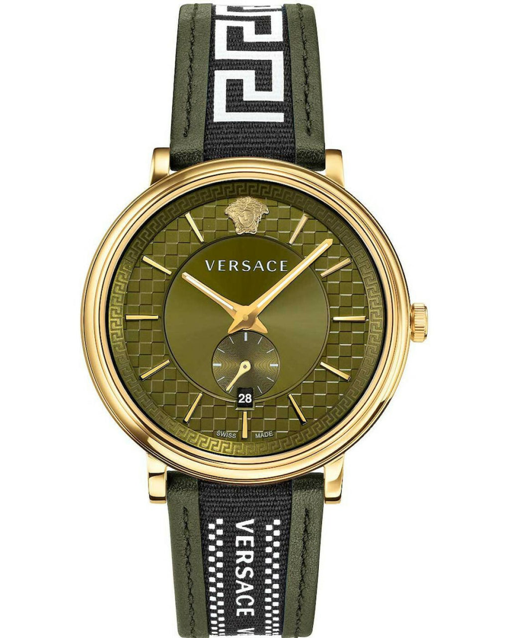 Gold ion-plated stainless steel case with a green leather strap with a black nylon center. Fixed gold ion-plated bezel. Green (greca embossed) dial with luminous gold-tone hands and index hour markers. The Medusa Head logo appears at the 12 o'clock position. Dial Type: Analog. Luminescent hands. Date display above the 6 o'clock position. Small seconds sub-dial. Quartz movement. Scratch resistant sapphire crystal. Pull / push crown. Solid case back. Round case shape. Case size: 42 mm. Case thickness: 7 mm. Band width: 20 mm. Tang clasp. Water resistant at 50 meters / 165 feet. Functions: date, hour, minute, second. V-circle Series. Dress watch style. Watch label: Swiss Made. Versace V-Circle Quartz Green Dial Men's Watch VEBQ01519.