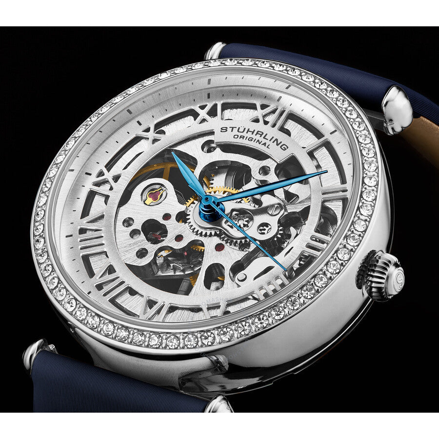 Silver-tone alloy case with a blue leather strap. Fixed silver-tone alloy bezel. Silver-tone dial with blue hands and Roman numeral hour markers. Minute markers around the outer rim. Dial Type: Analog. Automatic movement. Scratch resistant mineral crystal. Pull / push crown. Transparent case back. Round case shape, case size: 38 mm, case thickness: 13 mm. Buckle clasp. Water resistant at 50 meters / 165 feet. Functions: hour, minute, second. Legacy Series. Dress watch style. Stuhrling Original Legacy Automatic Silver Dial Ladies Watch M17195.