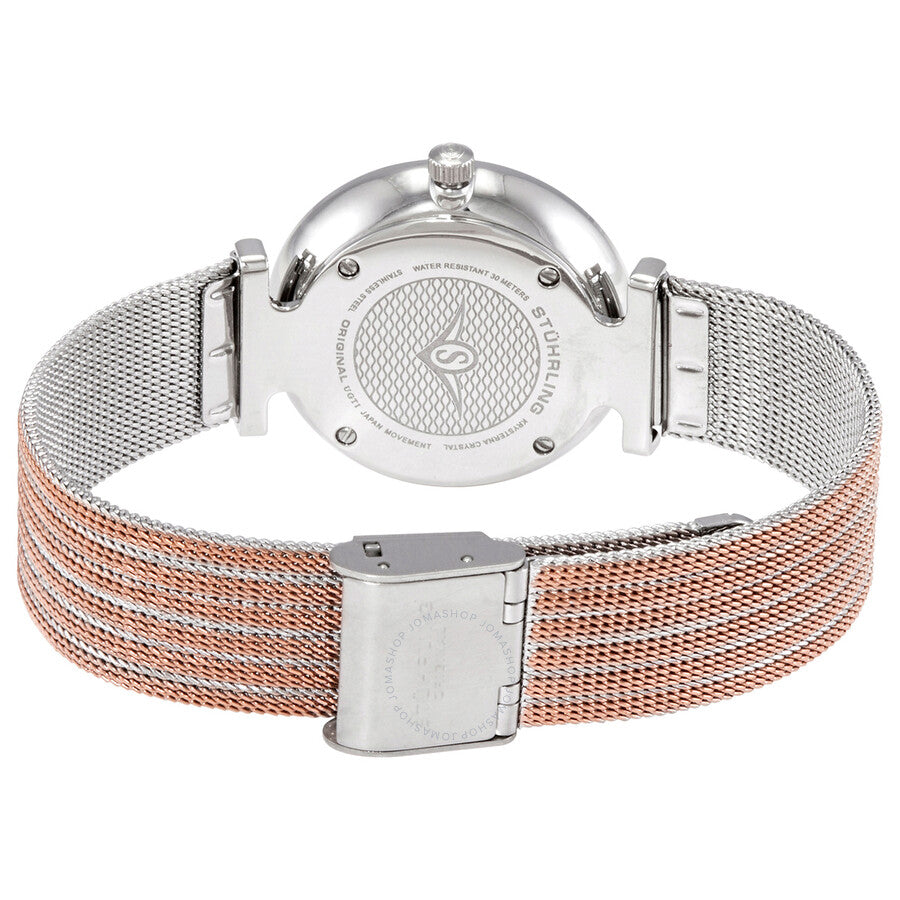 Experience elegance and euphoria with the Cambria, our featherweight wonder that delivers high style and chic design notes. Silver-tone alloy case with a two-tone (silver-tone and rose gold-tone) stainless steel bracelet. Fixed silver-tone alloy bezel. Blue dial with silver-tone hands and index hour markers. Crystals set at the 3, 6, 9 and 12 o'clock positions. Dial Type: Analog. Quartz movement. Scratch resistant mineral crystal. Pull / push crown. Solid case back. Round case shape. Case size: 32 mm. Case thickness: 7 mm. Fold over clasp. Water resistant at 30 meters / 100 feet. Functions: hour, minute, second. Symphony Series. Dress watch style. Stuhrling Original Symphony Blue Dial Ladies Watch M15667.