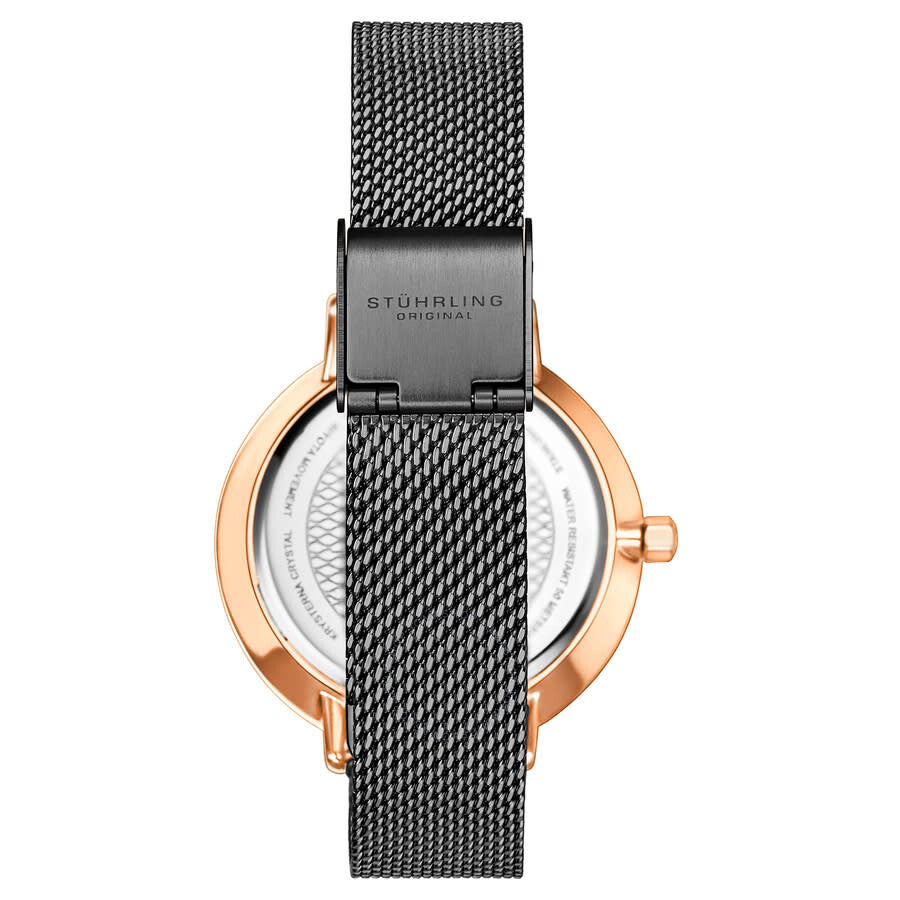 Rose gold-tone alloy case with a gunmetal stainless steel bracelet. Fixed rose gold-tone alloy bezel. Grey dial with rose gold-tone hands and index hour markers. Dial Type: Analog. Quartz movement. Scratch resistant mineral crystal. Pull / push crown. Solid case back. Round case shape, case size: 37 mm, case thickness: 8 mm. Band width: 14 mm, band length: 8.5 inches. Fold over clasp. Water resistant at 50 meters / 165 feet. Functions: hour, minute. Symphony Series. Dress watch style. Stuhrling Original Symphony Quartz Grey Dial Ladies Watch M16755.