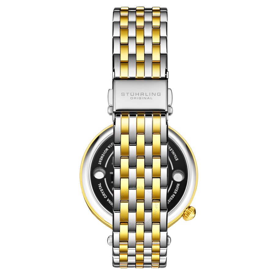 Silver-tone alloy case with a two-tone (silver-tone and yellow gold-tone) stainless steel bracelet. Fixed yellow gold-tone alloy bezel. Silver-tone dial with yellow gold-tone hands and index hour markers. Minute markers around the outer rim. Dial Type: Analog. Quartz movement. Scratch resistant mineral crystal. Pull / push crown. Solid case back. Round case shape, case size: 38 mm, case thickness: 9 mm. Band width: 22 mm, band length: 8.25 inches. Deployment with push button release clasp. Water resistant at 50 meters / 165 feet. Functions: hour, minute, second. Symphony Series. Dress watch style. Stuhrling Original Symphony Quartz Silver Dial Ladies Watch M16813.