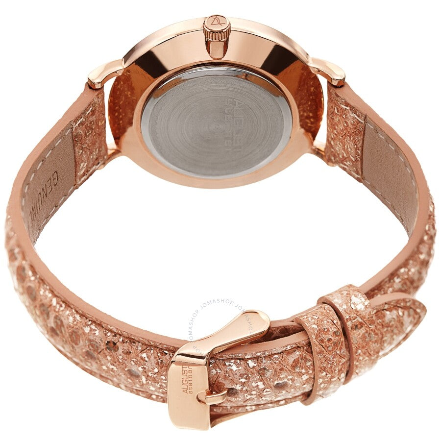 Rose gold-tone composite metal case with a pink (snakeskin pattern) leather strap. Fixed rose gold-tone composite metal bezel. White dial with rose gold-tone hands and Swarovski crystal hour markers. Dial Type: Analog. Quartz movement. Scratch resistant mineral crystal. Pull / push crown. Solid case back. Round case shape. Case size: 35 mm. Case thickness: 7.9 mm. Band width: 16 mm. Band length: 7.25 inches. Tang clasp. Water resistant at 30 meters / 100 feet. Functions: hour, minute, second. Fashion watch style. August Steiner Quartz Crystal White Dial Ladies Watch AS8258RG.