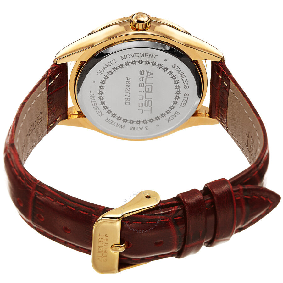Gold-tone composite metal case with a brown leather strap. Fixed fluted gold-tone composite metal bezel. Silver-tone dial with gold-tone hands and diamond hour markers. Minute markers around the outer rim. Dial Type: Analog. Quartz movement. Scratch resistant mineral crystal. Pull / push crown. Solid case back. Round case shape. Case size: 36 mm. Case thickness: 8.5 mm. Band width: 18 mm. Band length: 8.5 inches. Tang clasp. Water resistant at 30 meters / 100 feet. Functions: hour, minute, second. Fashion watch style. August Steiner Quartz Diamond Silver Dial Ladies Watch AS8277RD.