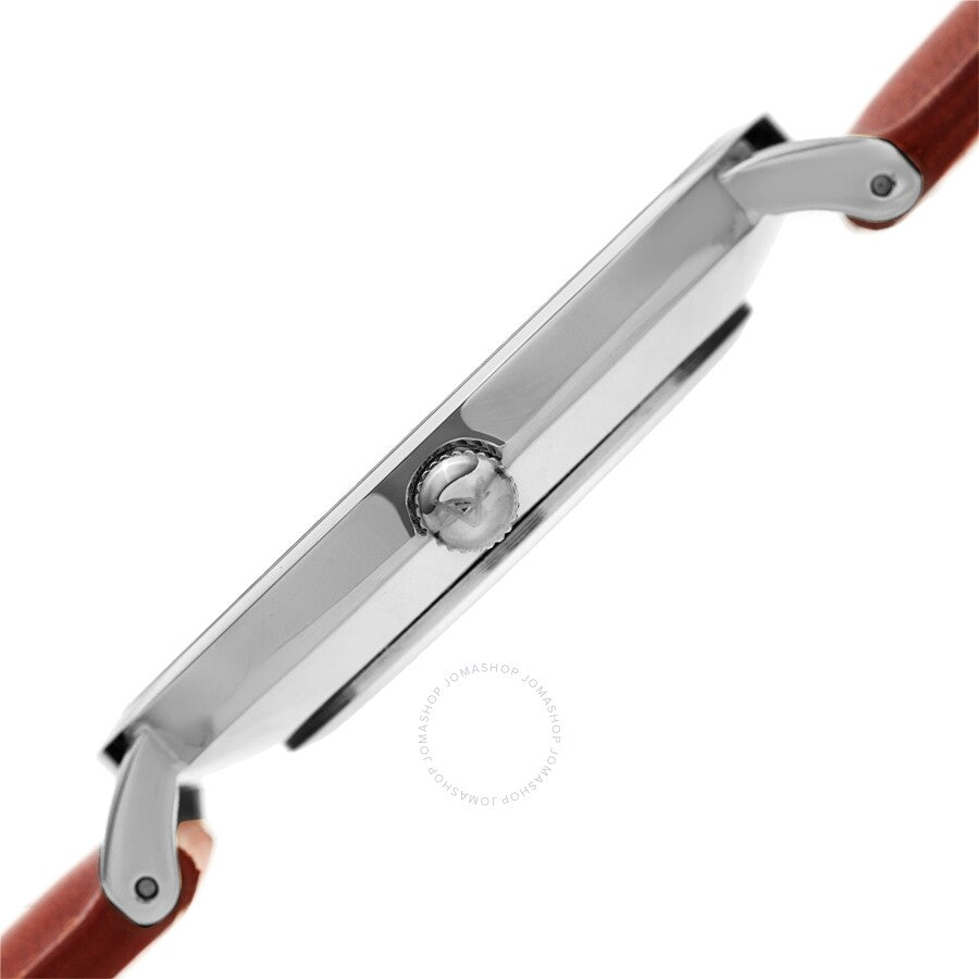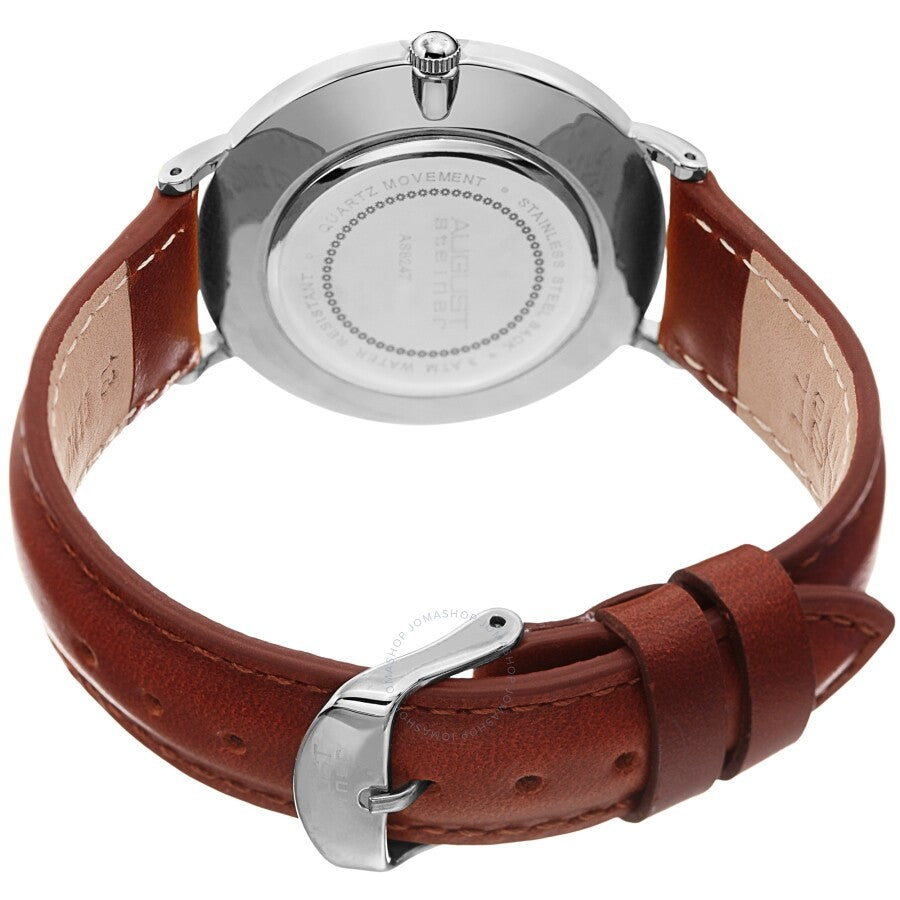 Silver-tone composite metal case with a brown leather strap. Fixed silver-tone composite metal bezel. White dial with silver-tone hands and index hour markers. Minute markers around the outer rim. Dial Type: Analog. Quartz movement. Scratch resistant mineral crystal. Pull / push crown. Solid case back. Round case shape. Case size: 38 mm. Case thickness: 6.5 mm. Band width: 18 mm. Band length: 7.5 inches. Tang clasp. Water resistant at 30 meters / 100 feet. Functions: hour, minute. Fashion watch style. August Steiner Quartz White Dial Ladies Watch AS8247SSBR.