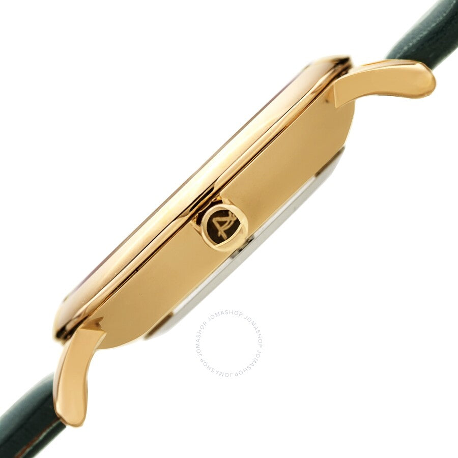 Gold-tone composite metal case with a two-tone (black and green) leather strap. Fixed gold-tone composite metal bezel. White dial with gold-tone hands and index hour markers. Dial Type: Analog. Quartz movement. Scratch resistant mineral crystal. Pull / push crown. Solid case back. Round case shape. Case size: 36 mm. Case thickness: 8.5 mm. Band width: 16 mm, band length: 8 inches. Tang clasp. Water resistant at 30 meters / 100 feet. Functions: hour, minute, second. Fashion watch style. August Steiner Quartz White Dial Ladies Watch AS8261GN.