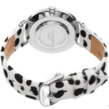 Silver-tone composite metal case with a white (dalmation print) leather strap. Fixed silver-tone composite metal bezel. White dial with black stick-style hands and Roman numeral hour markers. Minute markers around the outer rim. Dial Type: Analog. Quartz movement. Scratch resistant mineral crystal. Pull / push crown. Solid case back. Round case shape. Case size: 36 mm. Case thickness: 7 mm. Band width: 16 mm. Band length: 7.5 inches. Tang clasp. Water resistant at 30 meters / 100 feet. Functions: hour, minute, second. Fashion watch style. Akribos XXIV Quartz White Dial Ladies Watch AK1080SS.