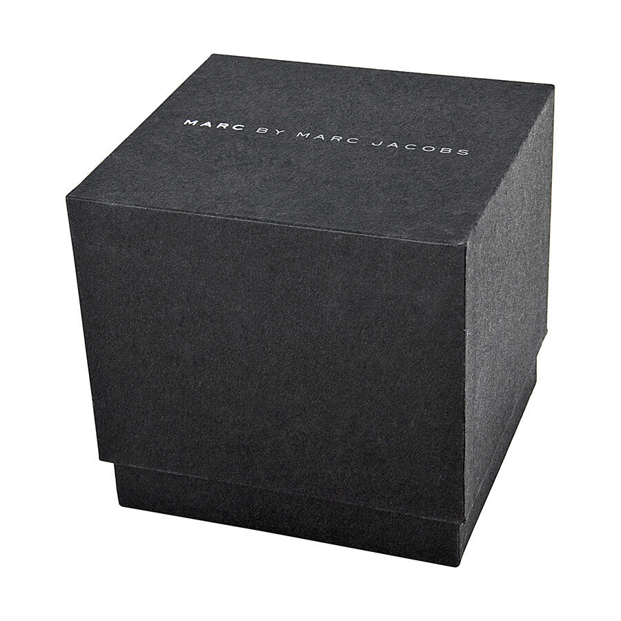 Stainless steel case with a two-tone (silver and gold-tone) stainless steel bracelet. Fixed gold-tone bezel. Silver dial with gold-tone hands and crystal hour markers. Dial Type: Analog. Date display between 4 and 5 o'clock positions. Chronograph - three sub-dials displaying: 60 second, 60 minute and 24 hour. Quartz movement. Scratch resistant mineral crystal. Pull / push crown. Solid case back. Case diameter: 41 mm. Case thickness: 12 mm. Round case shape. Band width: 20 mm. Fold over clasp with double push button safety. Water resistant at 50 meters / 165 feet. Casual watch style. Marc by Marc Jacobs Chronograph Silver Dial Two-tone Ladies Watch MBM3177.